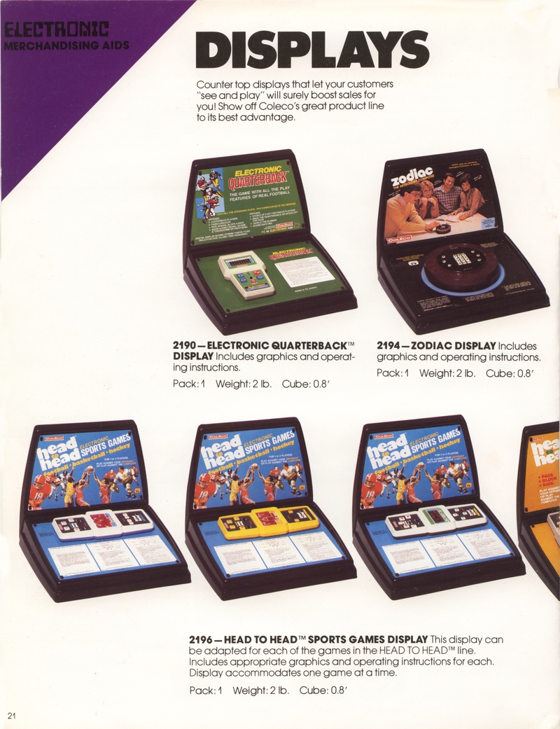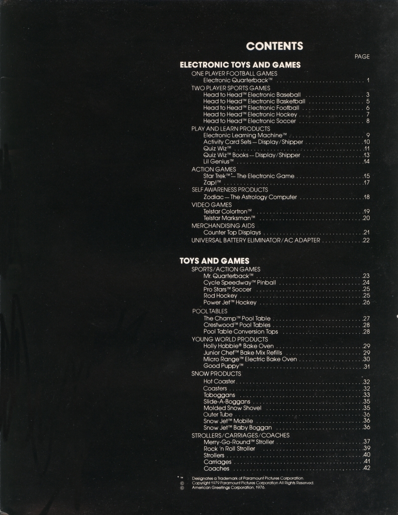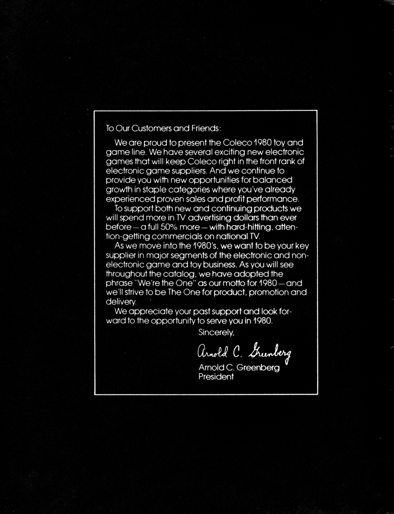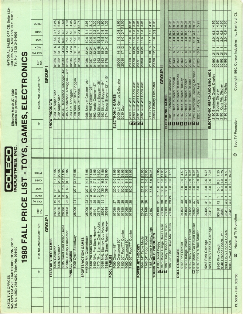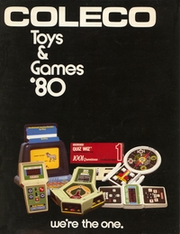 | DESCRIPTION | Coleco Toys and Games '80 - We're the One: Catalog of electronic, plastic, and variant toys from Coleco for the 1980 store season. This catalog was intended for chains and purchasers for stores to browse through and buy Coleco products by the truckload. Therefore, the prices are on a separate green sheet of paper, and the catalog itself focuses on top-quality shots of all the toys. Toys include electronic football, hockey, socker and basketball games, Quiz Wiz, Lil Genius, Zodiac, Colortron, Marksman, Cycle Speedway, Power Jet Hockey, and a wide range of toboggans and plastic pieces rebranded as "slide-a-boggans". Also has a range of strollers and baking ovens. Great colors, great descriptions, many dreams inside. (1980) |