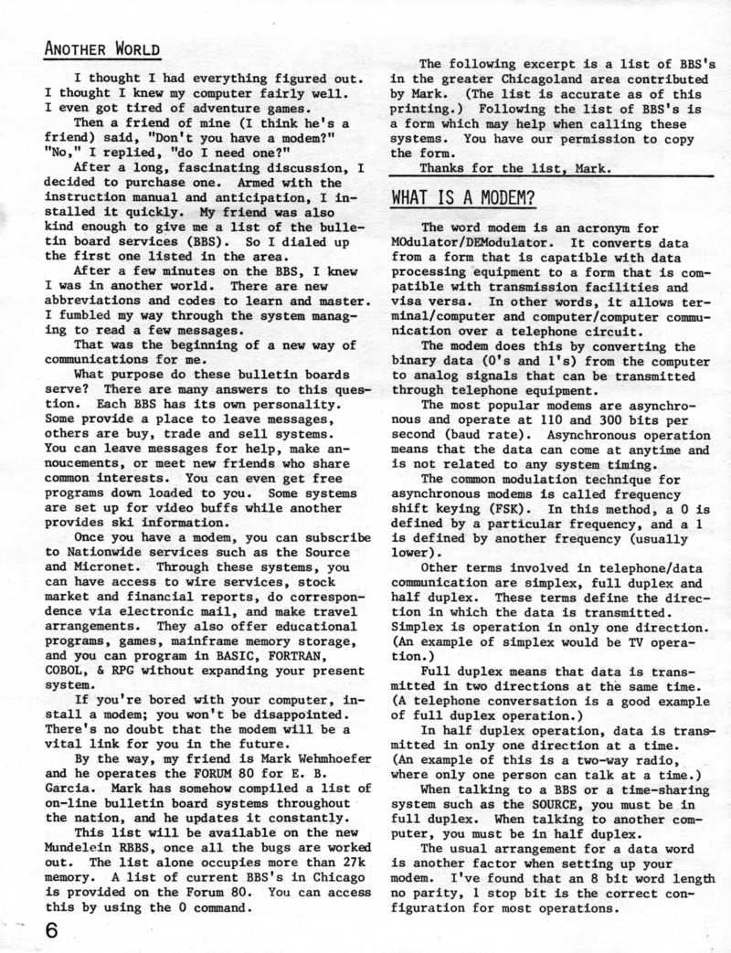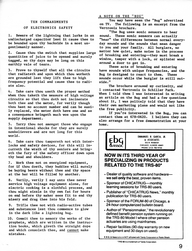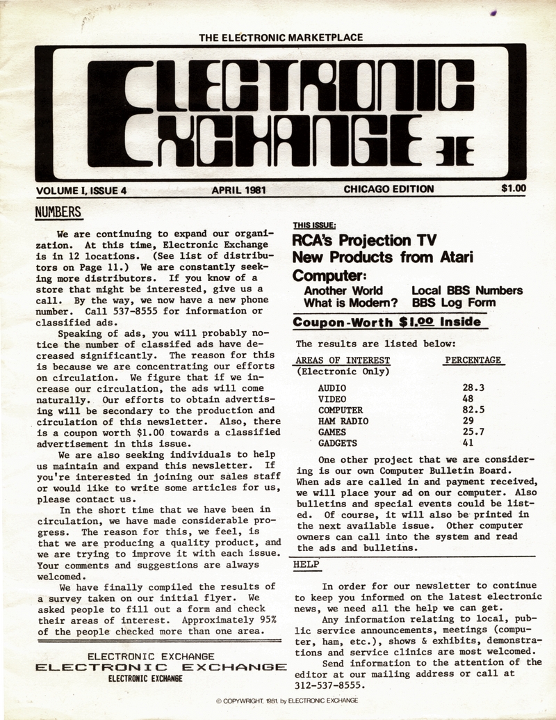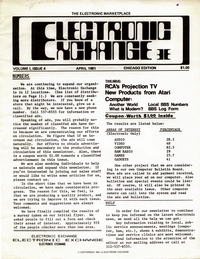 | DESCRIPTION | The April 1981 Chicago Edition of "Electronic Exchange". Covers RCA's projection TV, new products from Atari, a 312 area code BBS list, electronics safety, and ads for the National Computer Congress and other newsletters. (1981) |