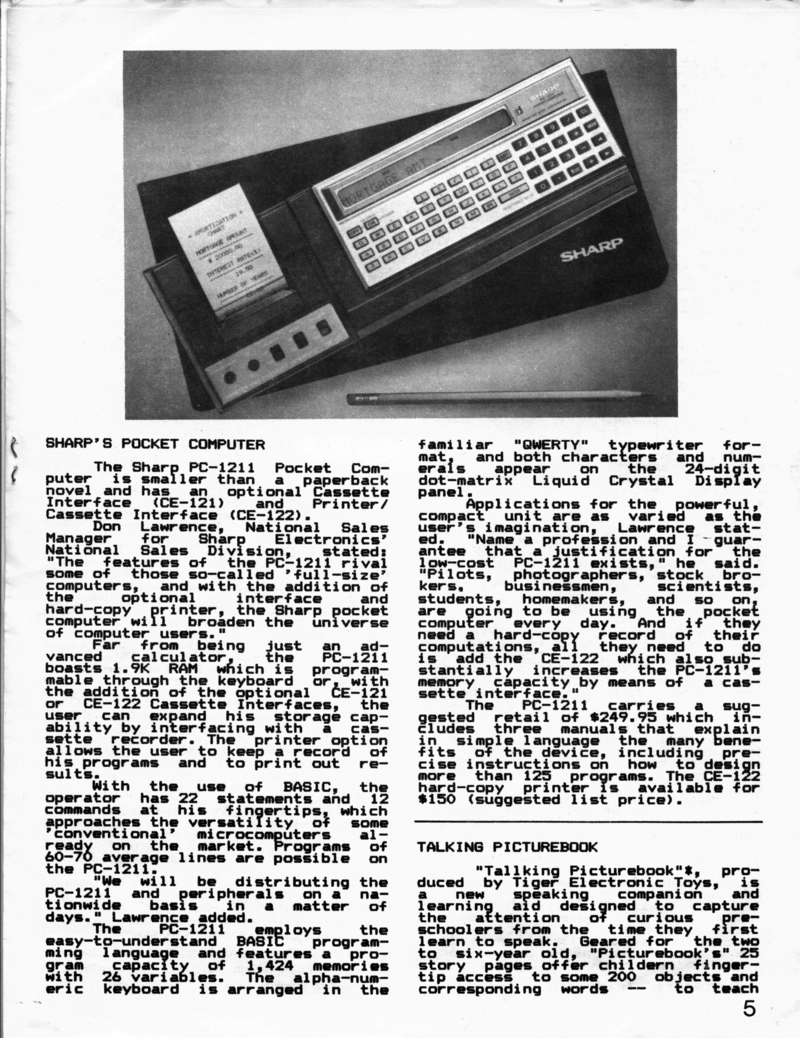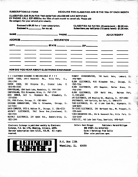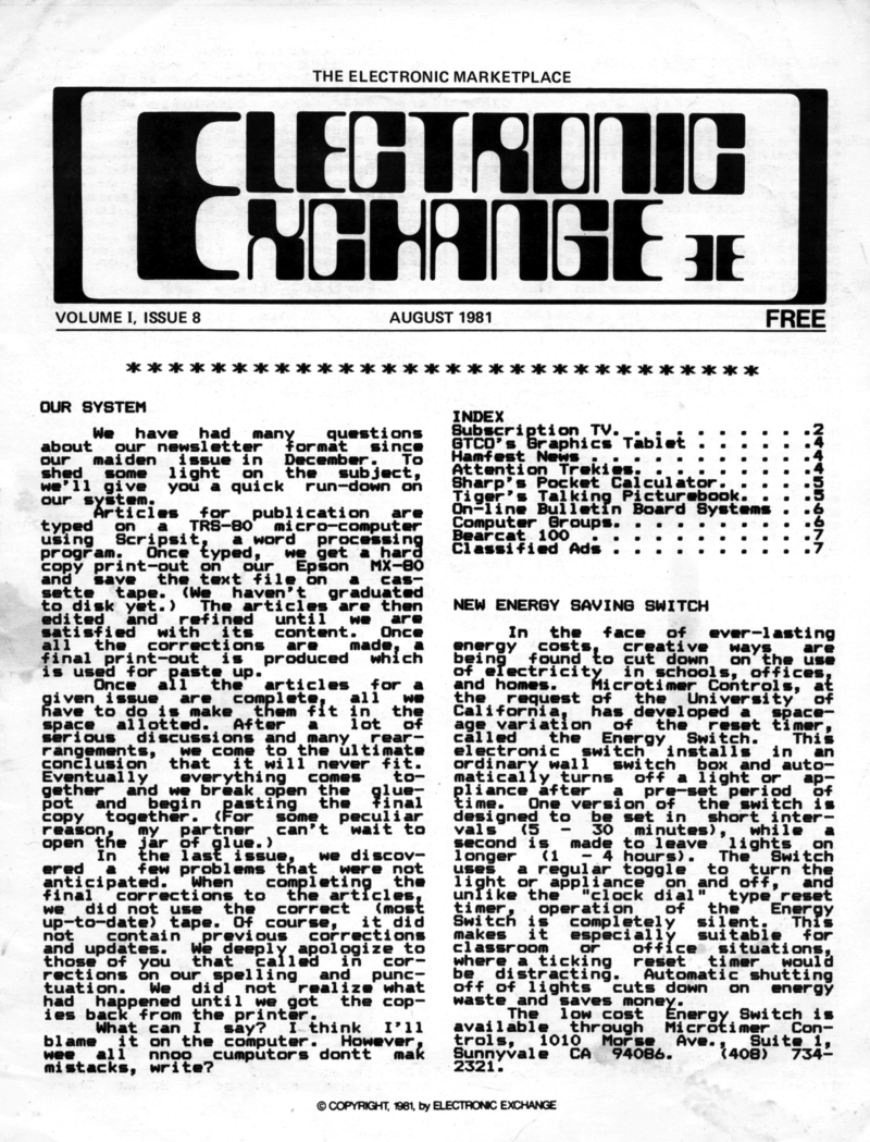 | DESCRIPTION | The August 1981 edition of the Electronic Exchange Newsletter. (Volume 1, Issue 8). Includes description of how the newsletter is made, subscription TV, Hamfest News, Sharp's Pocket Calculator, Tiger's Talking Picturebook, a list of bulletin boards, and a review of the Bearcat 100 (August, 1981) |