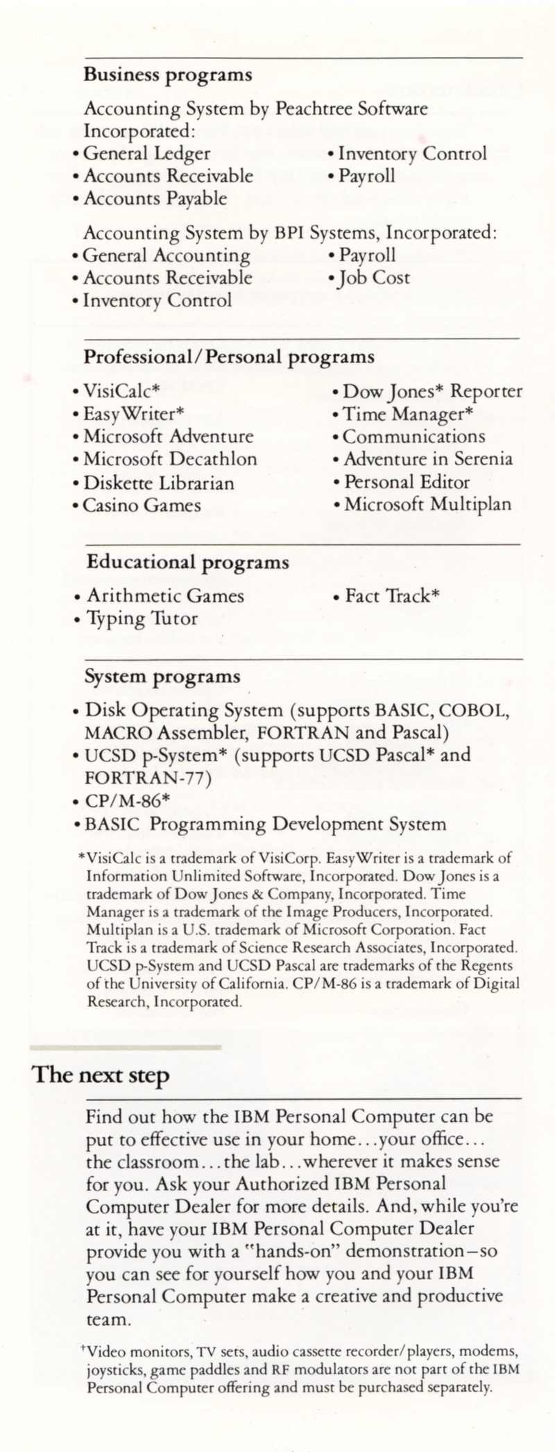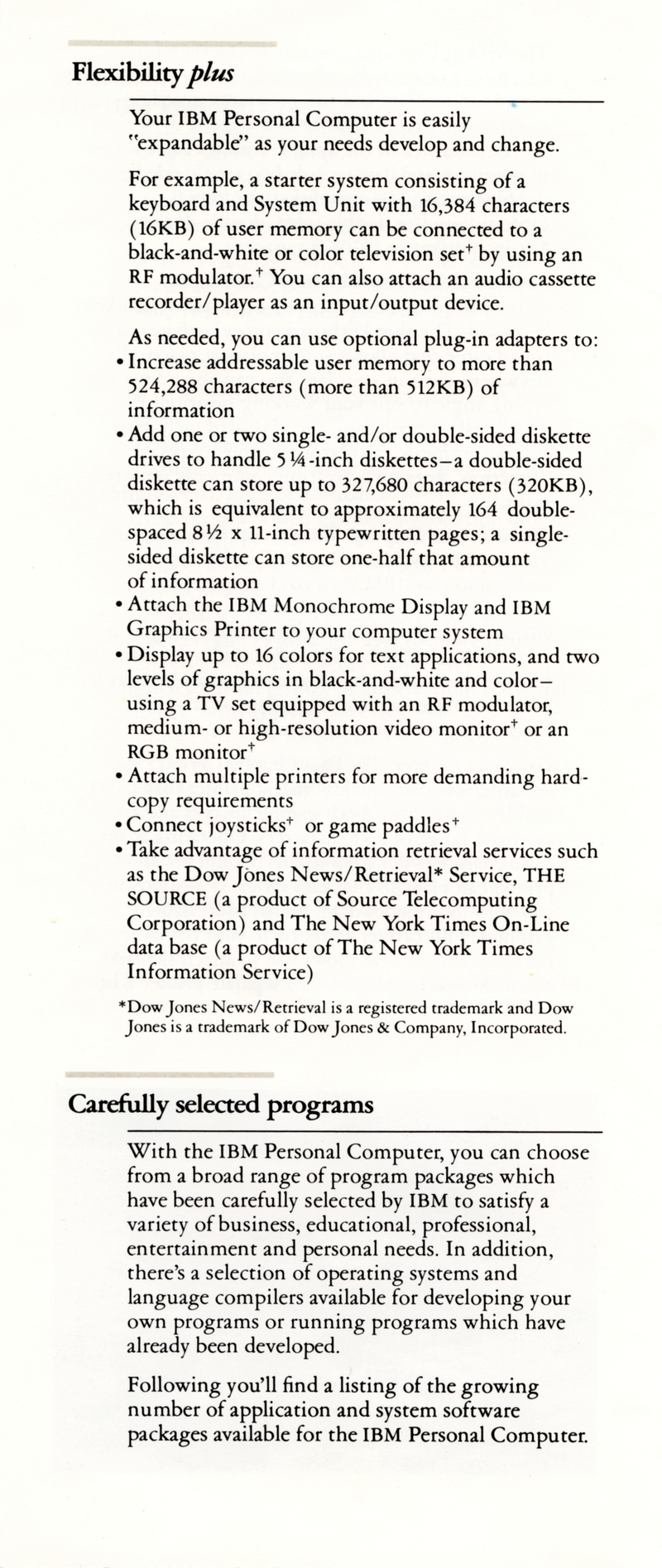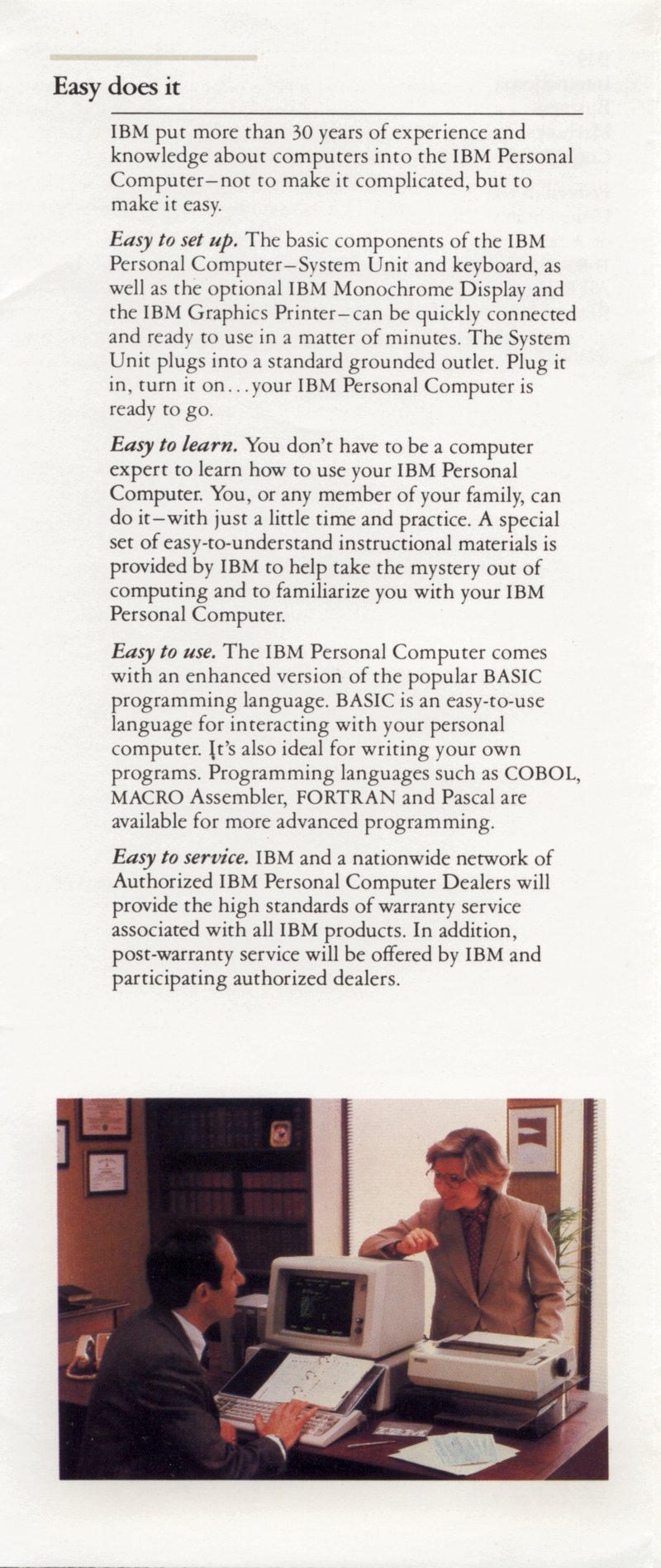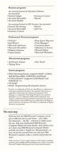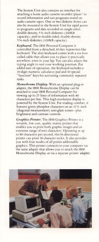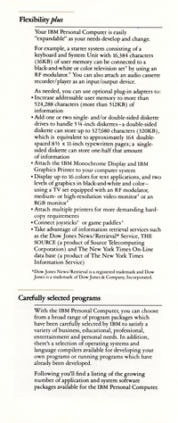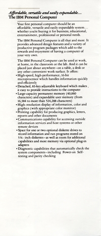 | DESCRIPTION | Brochure for the IBM Personal Computer (PC). Contains information on the system, software available, and types of additional services that could be purchased. This was the November 1982 version of the brochure, meaning it was part of the first wave of IBM PCs, with the full weight of the IBM Marketing Machine behind it (1982) |