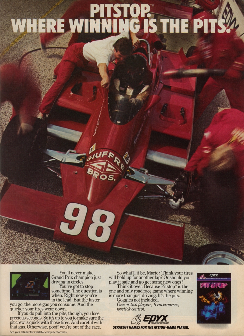 | DESCRIPTION | Collection of three full-page ads from Epyx software in the December 1983 issue of Electronic Games Magazine. Advertisements for Temple of Apshai (you're just in time for lunch), Jumpman (watch your step) and Pitstop (where winning is the pits). Standard high-action photographs, not entirely related to the games being advertised (1983) |