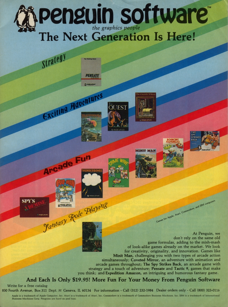| DESCRIPTION | Penguin Software, the Graphics People: The Next Generation is Here! Strategy, Exciting Adventures, Arcade Fun, and Fantasy Role Playing. From the December 1983 issue of Electronic Games Magazine (1983) |