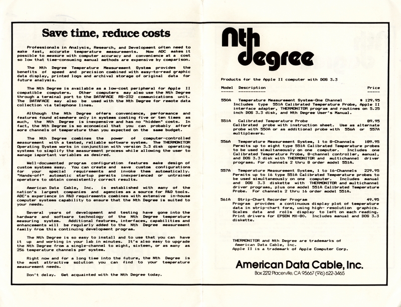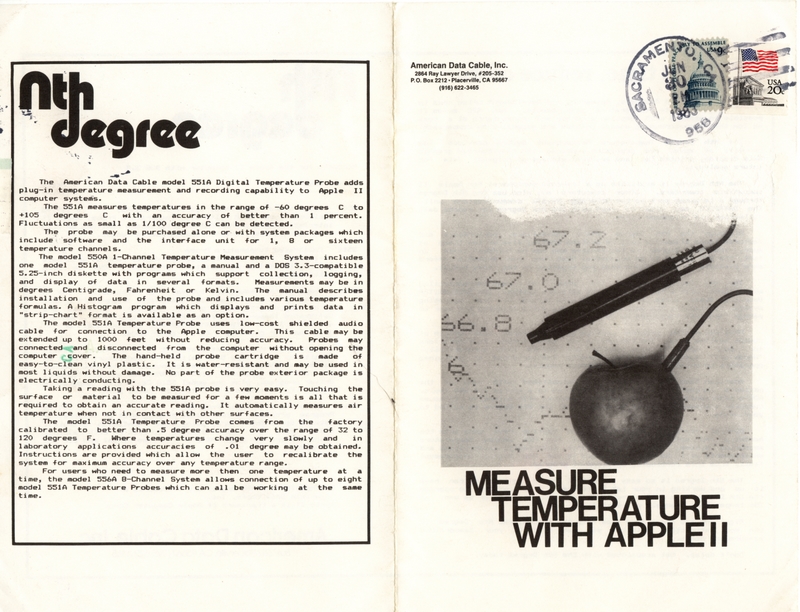 | DESCRIPTION | Mailing for the "Nth Degree", an Apple II temperature probe (model 551A) by American Data Cable, Inc. Postmarked June 30, 1983 (1983) |