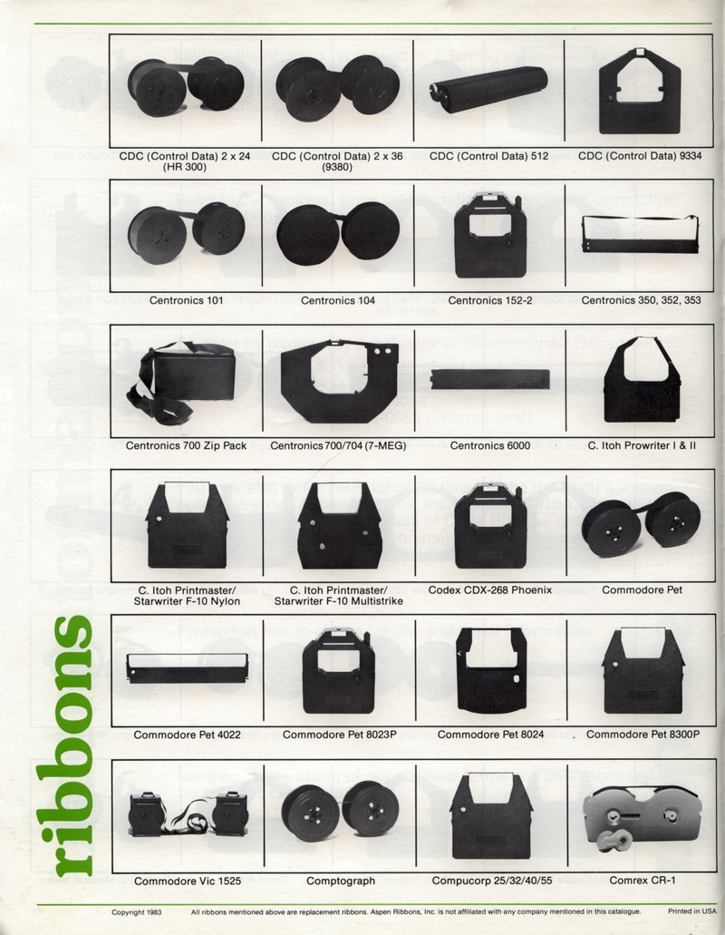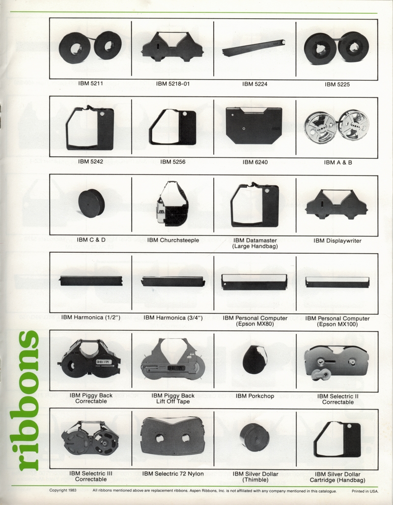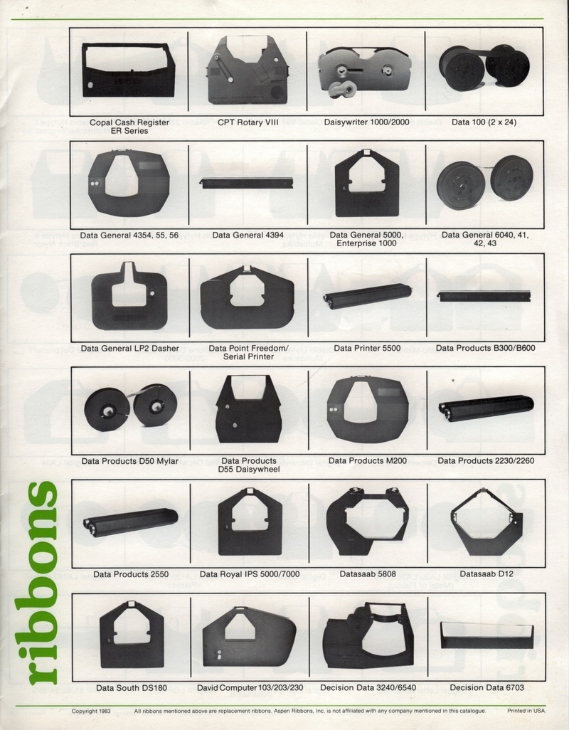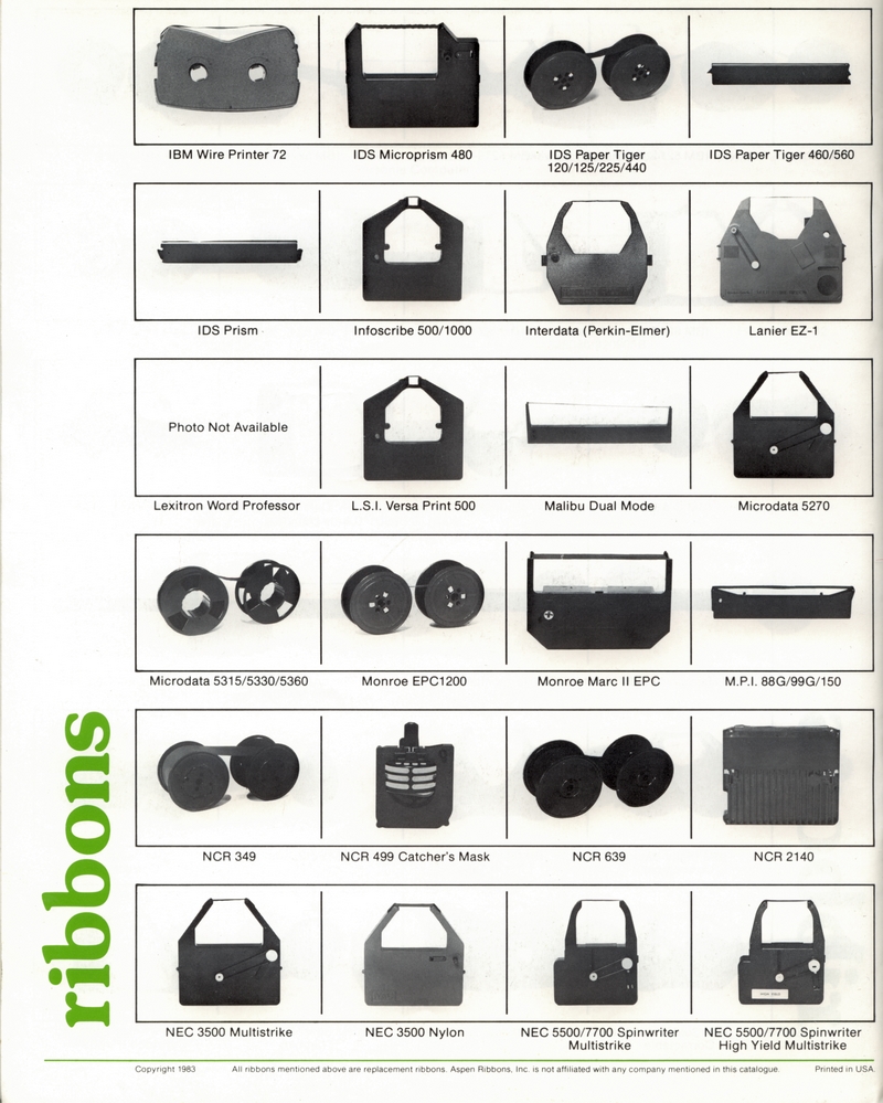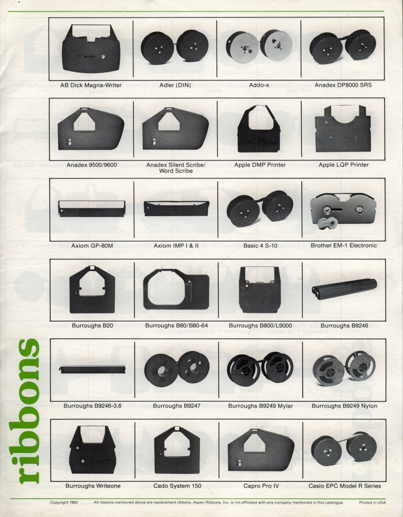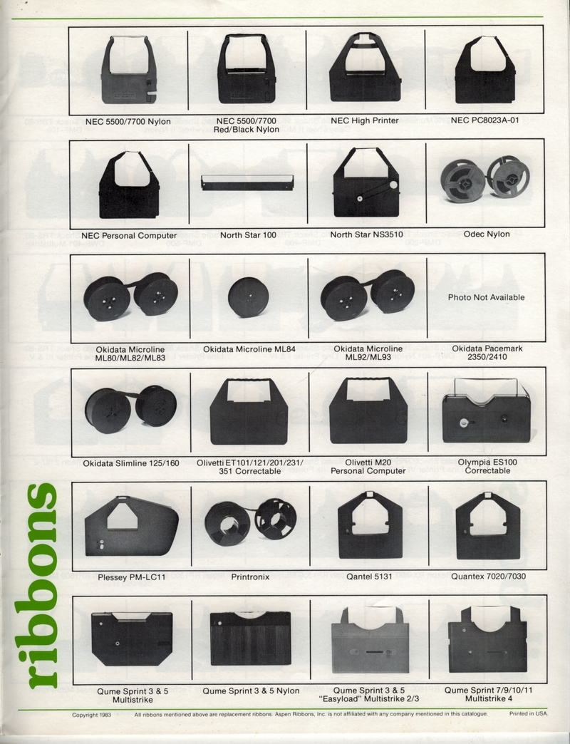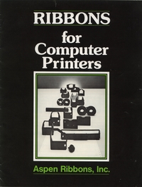 | DESCRIPTION | Ribbons for Computer Printers, from Aspen Ribbons, Incorporated. 16 page catalog of cartridges and parts for computer printers (dot matrix, not laser) circa early 1980s. The photos of the parts don't look great because they WEREN'T great. Over 300 computer ribbons listed, as well as a handy chart of ribbon supplies to printer manufacturers (1983) |