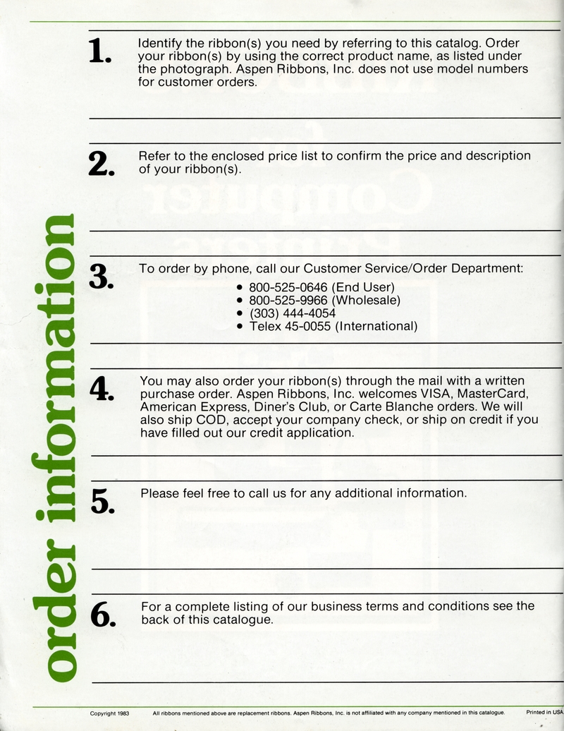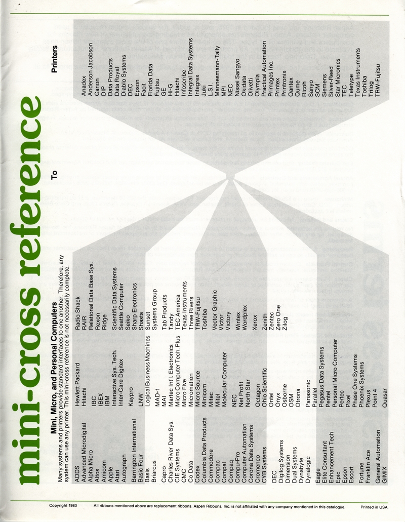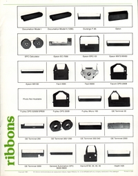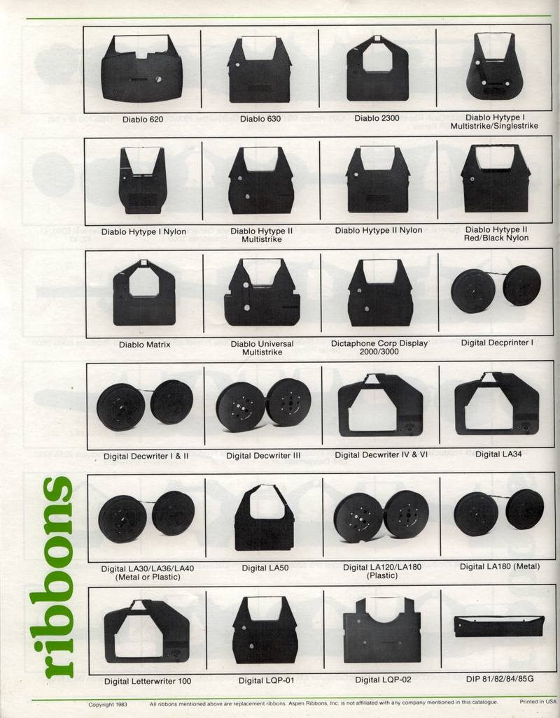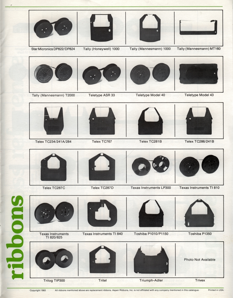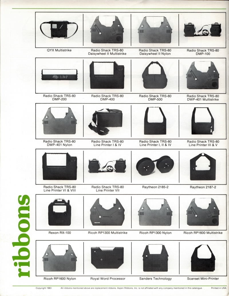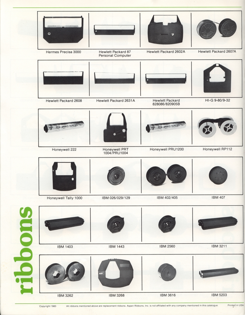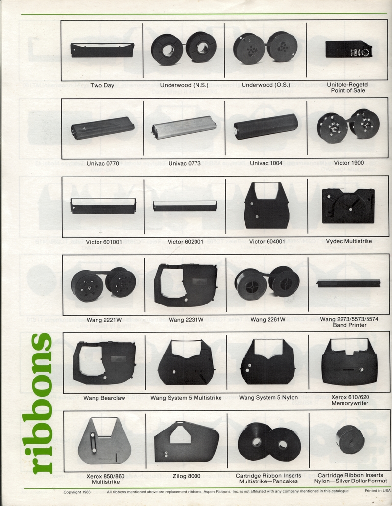 | DESCRIPTION | Ribbons for Computer Printers, from Aspen Ribbons, Incorporated. 16 page catalog of cartridges and parts for computer printers (dot matrix, not laser) circa early 1980s. The photos of the parts don't look great because they WEREN'T great. Over 300 computer ribbons listed, as well as a handy chart of ribbon supplies to printer manufacturers (1983) |