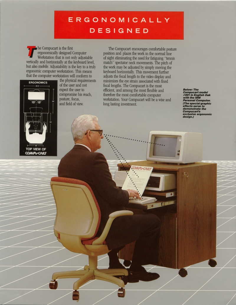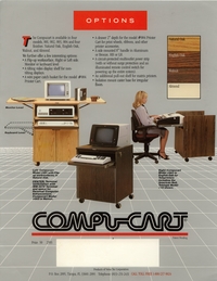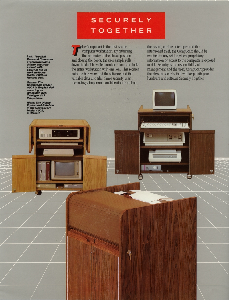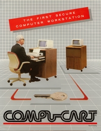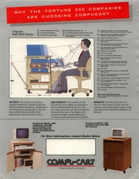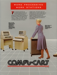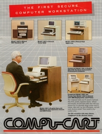| DESCRIPTION | 6-Page Brochure for the Compucart from Versa-Tec, the "First Secure Computer Workstation", showing several models in use with contemporary computer models, including an unusual Apple Lisa, as well as 1-sheet promotional brouchure for science/ergonomics of the Compu-Cart (1983) |