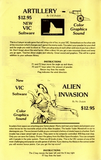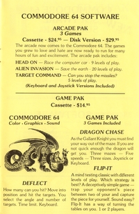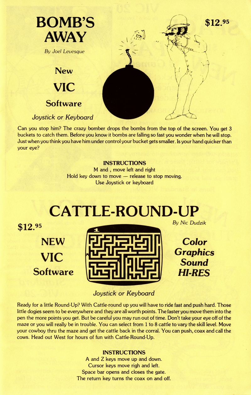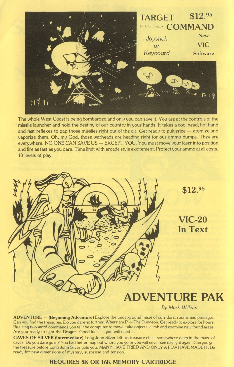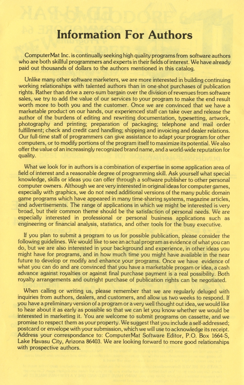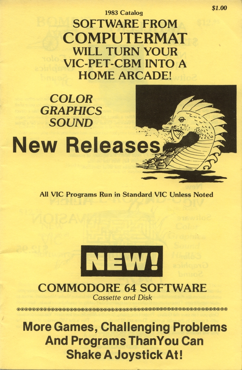 | DESCRIPTION | 20-page catalog (two pages are combined as a spread) of a Commodore VIC and C-64 catalog for Computermat Systems, a publisher of games and adventures. Includes call for authors, lists of games, and offers of packs and specials (1983) |