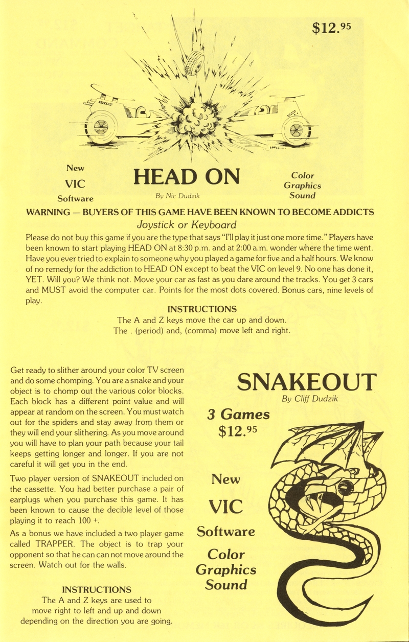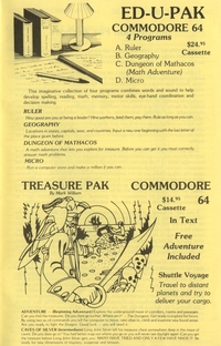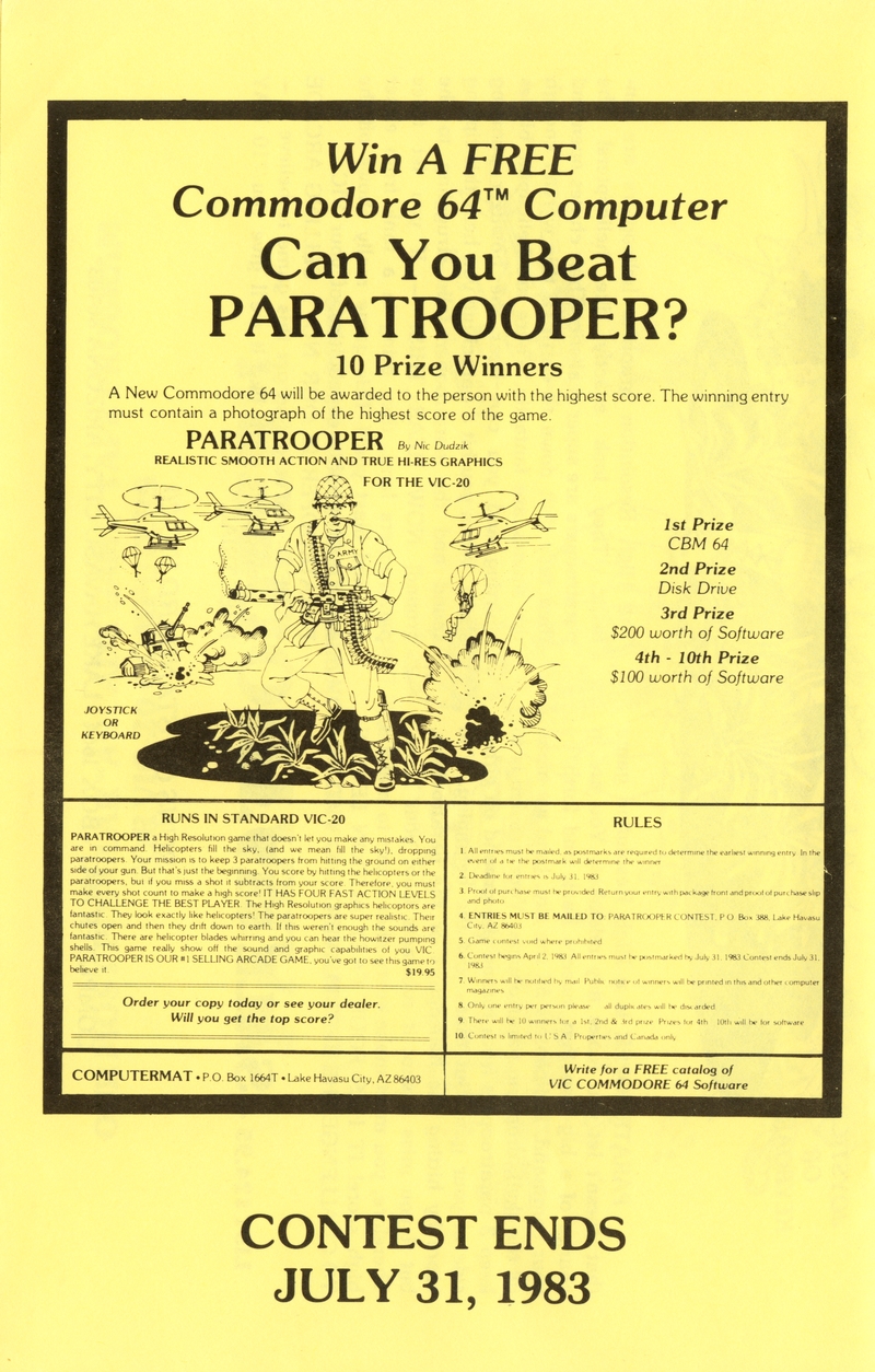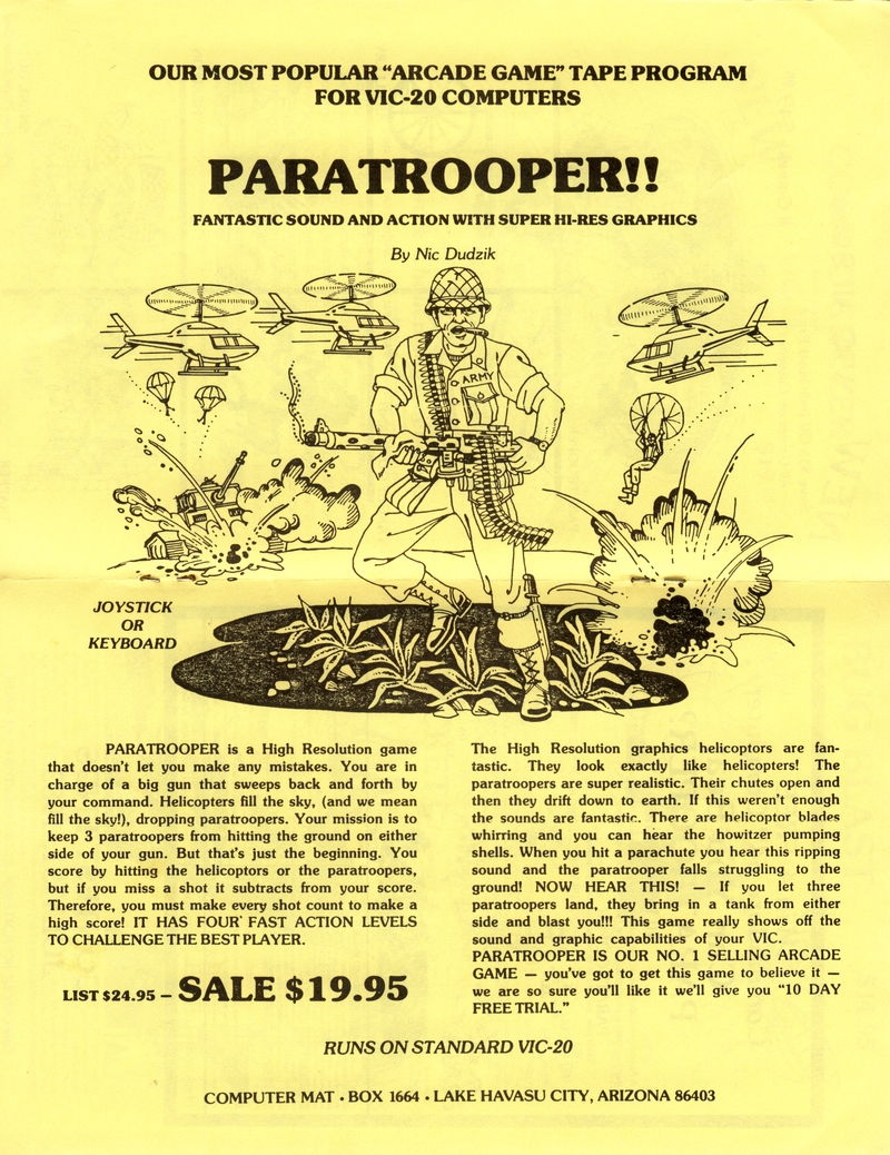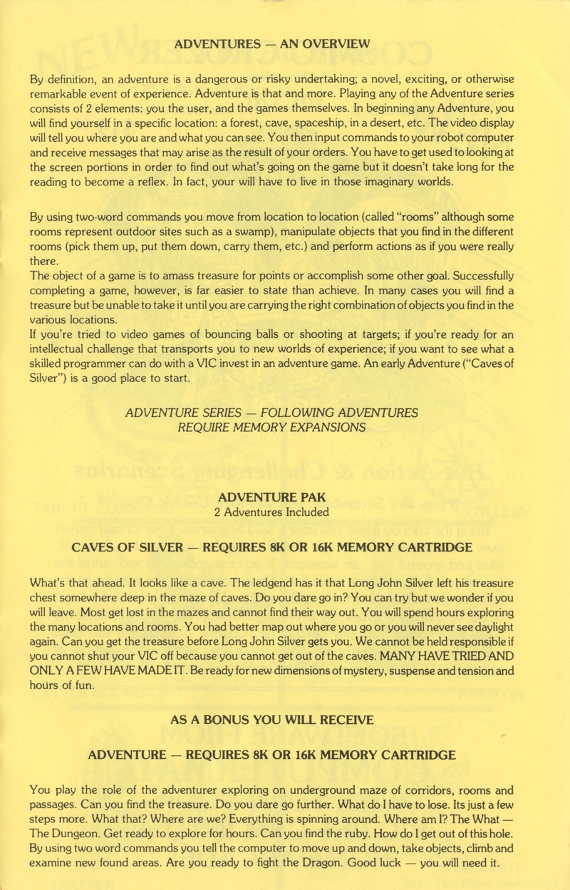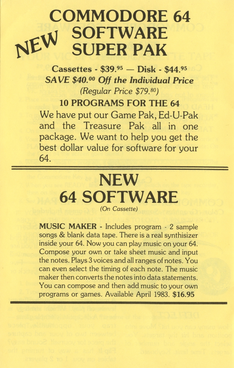 | DESCRIPTION | 20-page catalog (two pages are combined as a spread) of a Commodore VIC and C-64 catalog for Computermat Systems, a publisher of games and adventures. Includes call for authors, lists of games, and offers of packs and specials (1983) |