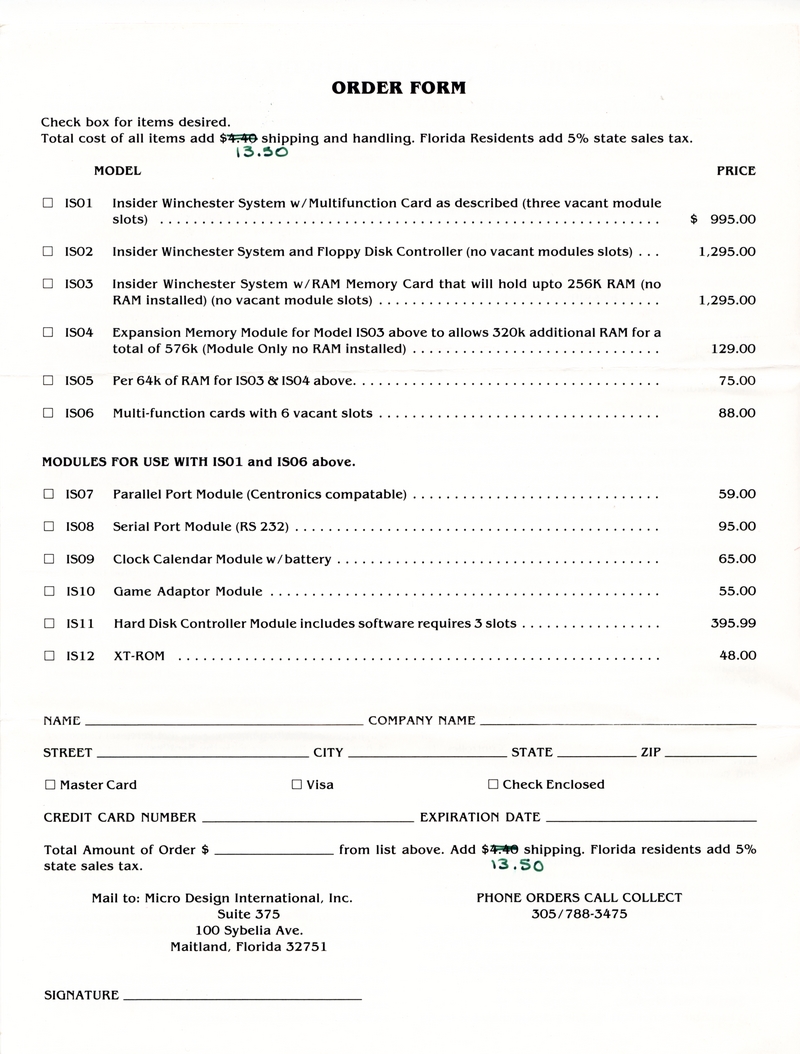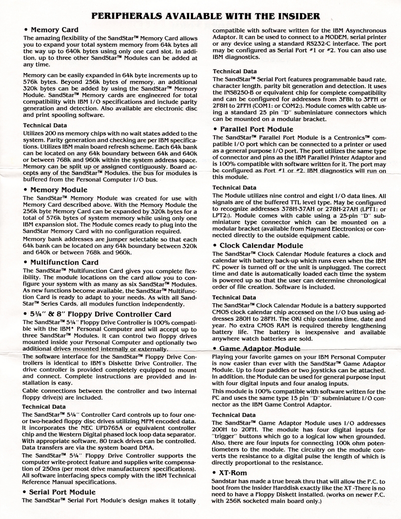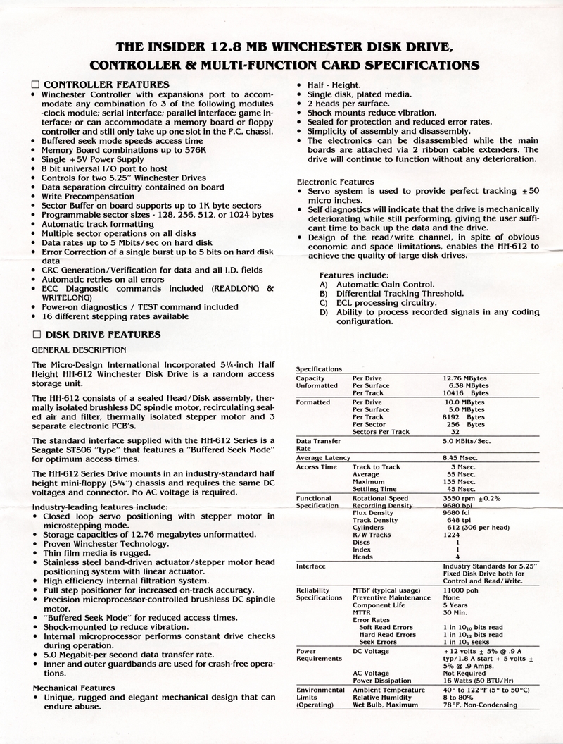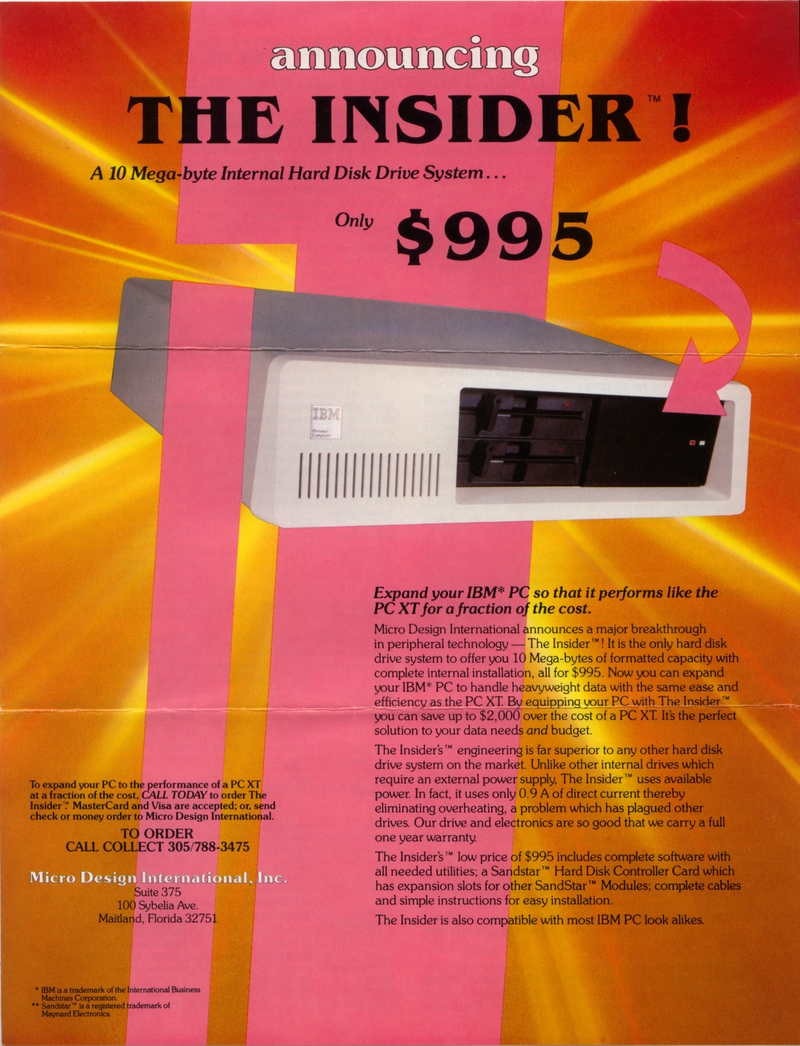| DESCRIPTION | Announcing the Micro Design International Insider, an expansion to add a full 10 Mega-byte Internal Hard Disk Drive to your PC, giving it the performance of an XT for a fraction of the cost, that is, $995 (1983) |