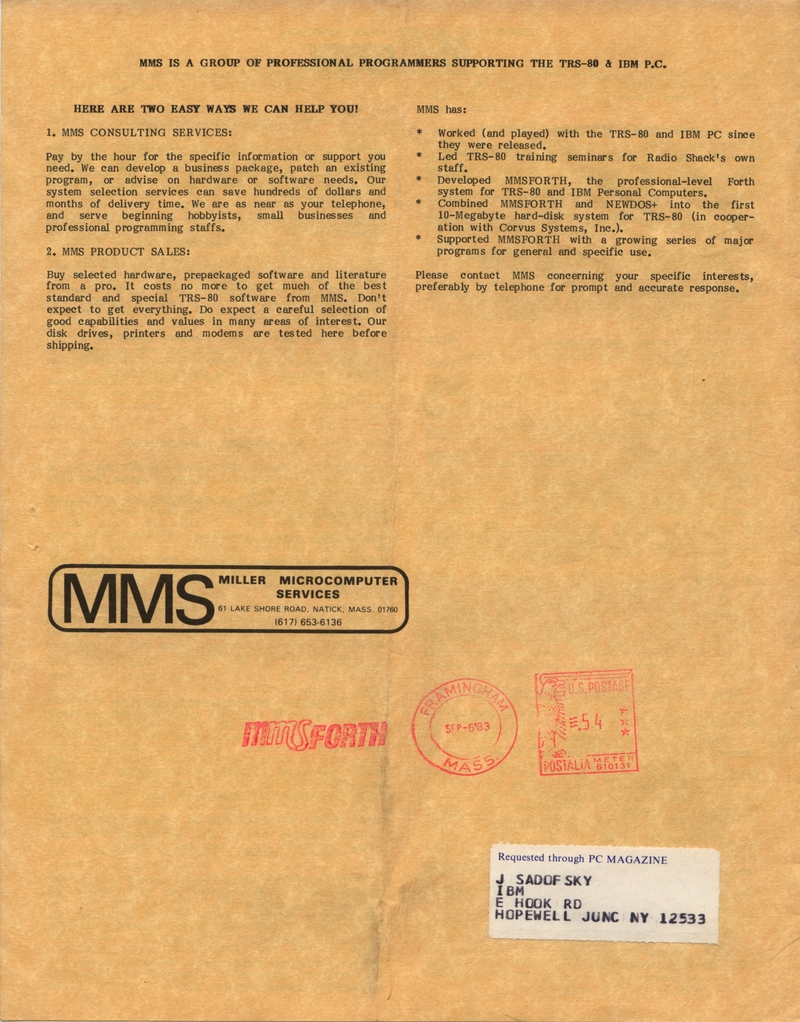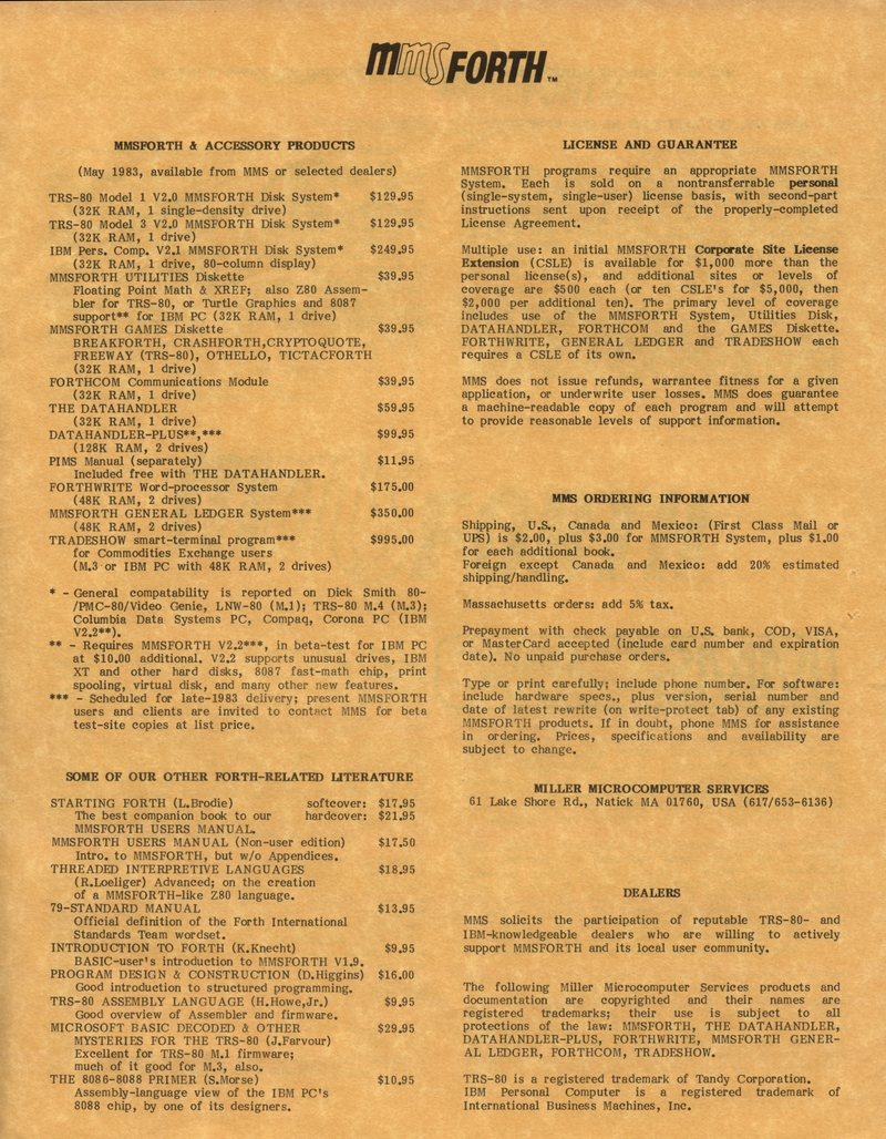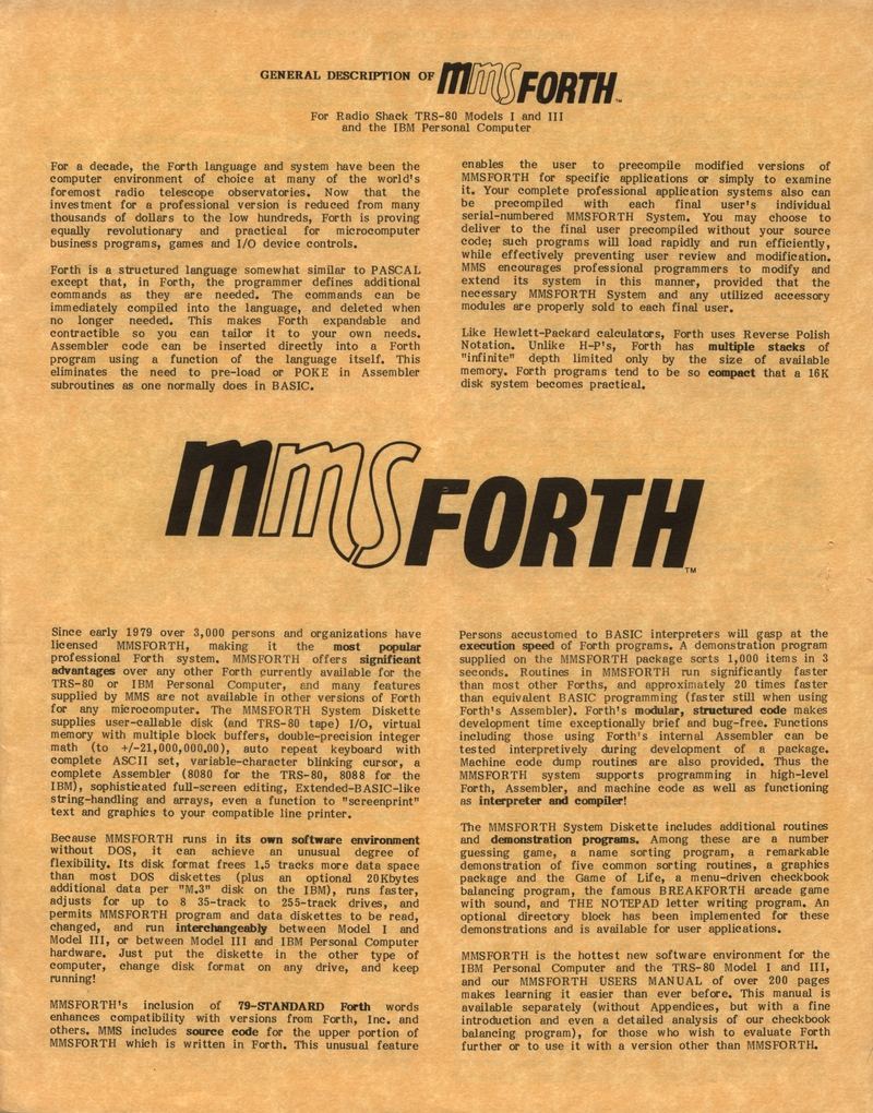 | DESCRIPTION | Brochure of MMS (Miller Microconputer Systems) Forth and Forth Software (1983) |
