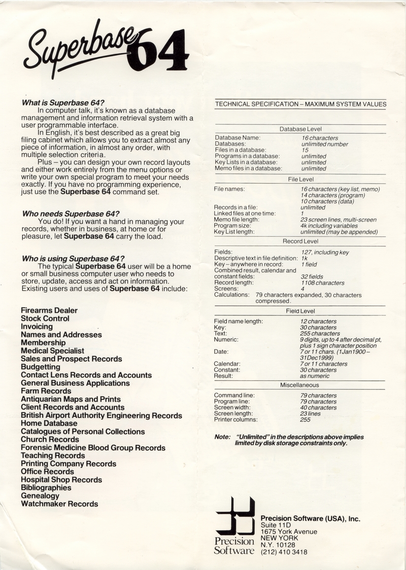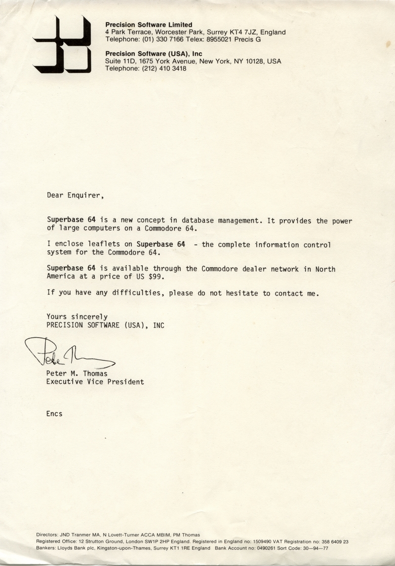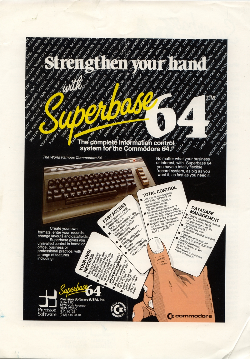 DESCRIPTIONCover letter and flyer for the Superbase 64 by Precision Software of Surrey and New York, the "new concept in database management / complete information system for the Commodore 64" (1983)