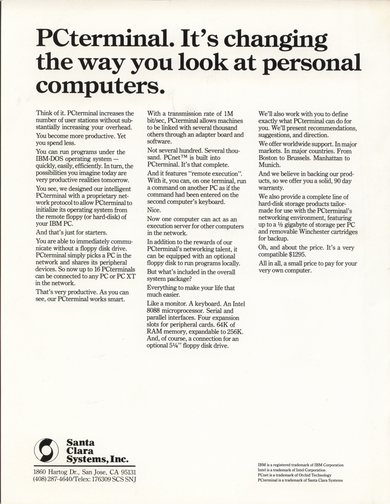 | DESCRIPTION | Brochure for the PCTerminal from Santa Clara Systems (1983) |