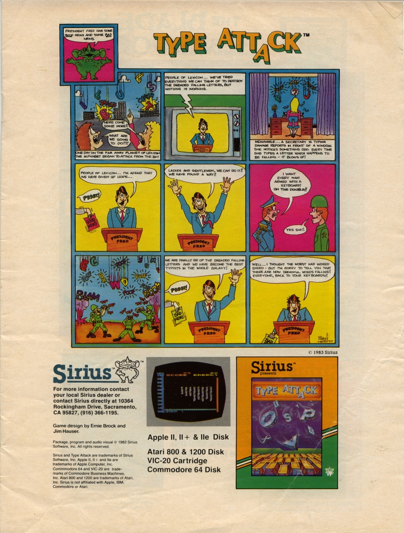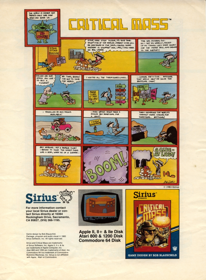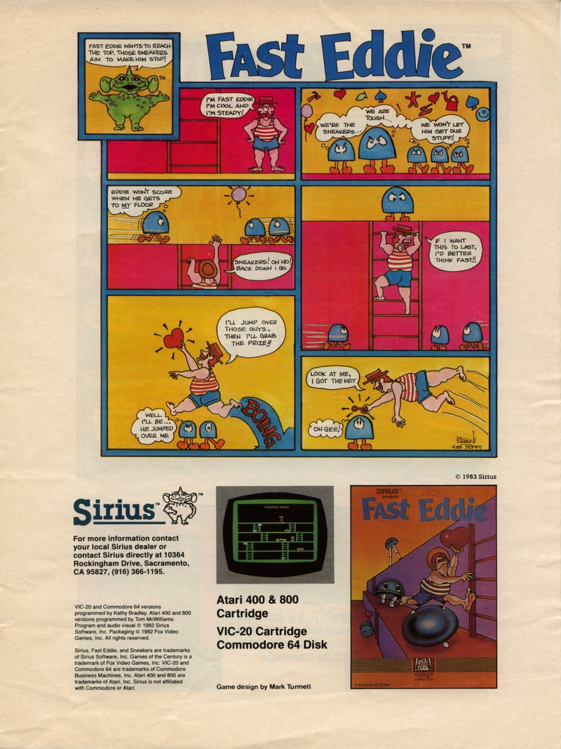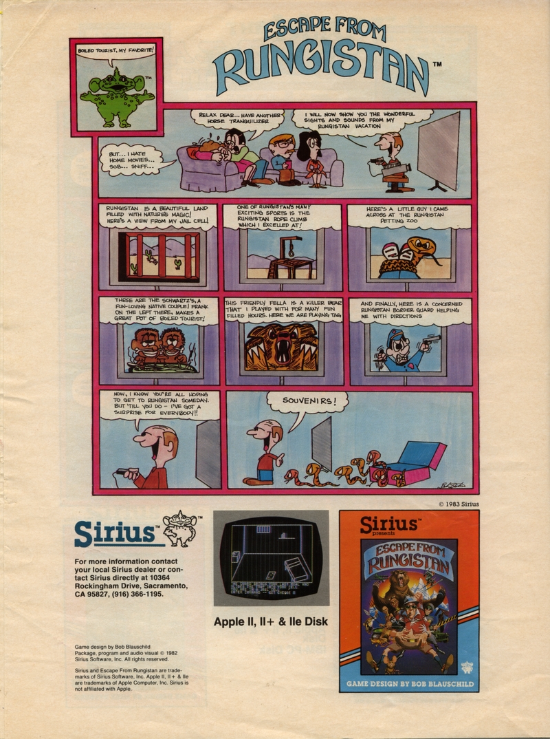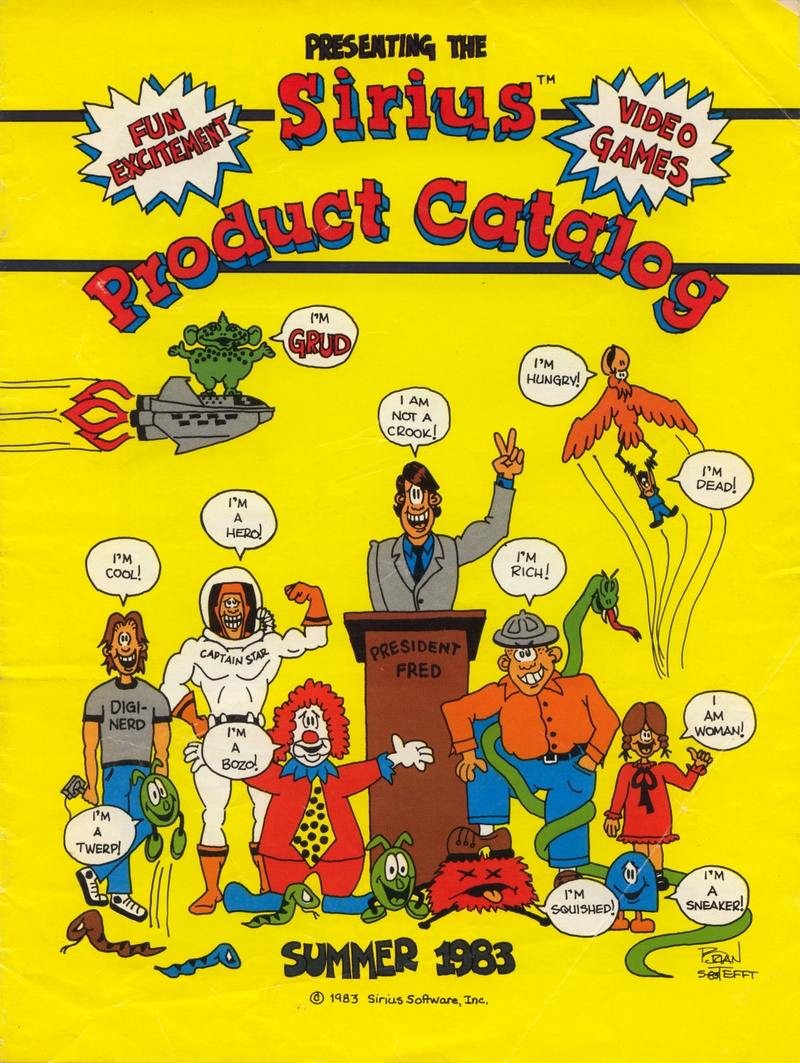 | DESCRIPTION | The Sirius Software Summer 1983 Game Catalog, listing the full collection of Sirius software games, all accompanied by poorly-drawn comics portraying each game's premise as a story involving cartoon characters (1983) |