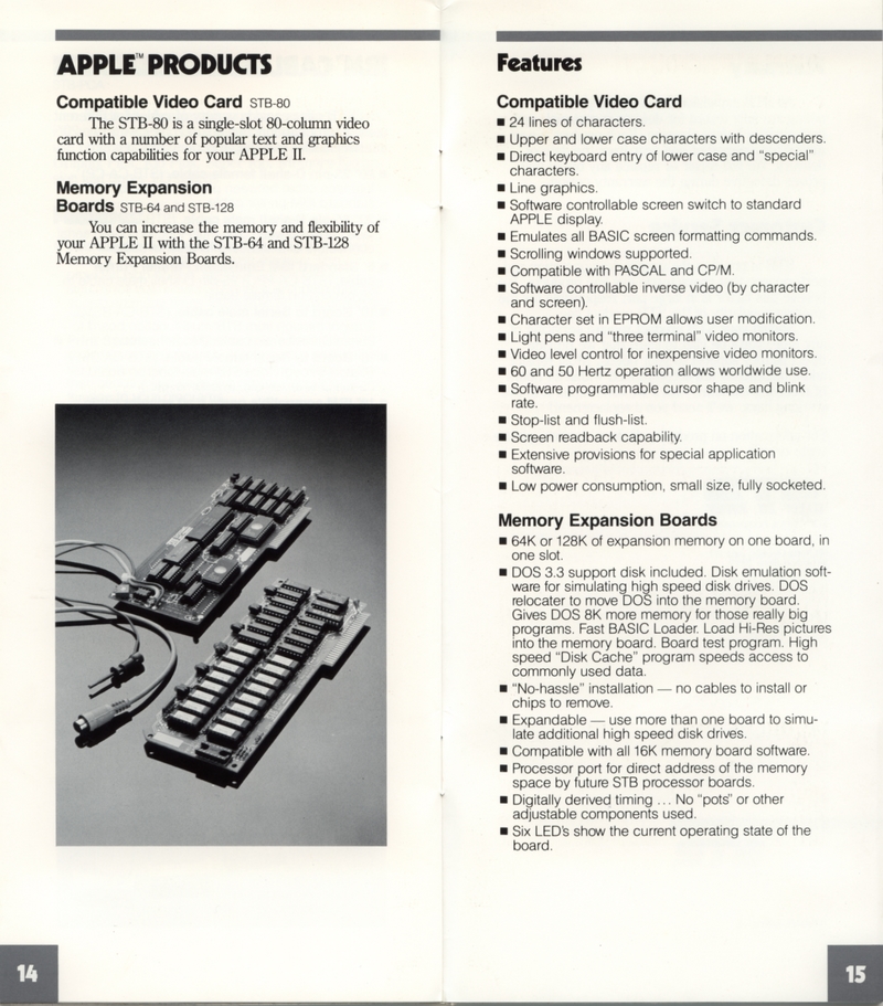 | DESCRIPTION | "STB Systems Incorporated: Expansion Products for Personal Computing" - Small brochure catalog for a range of expansion cards for Apple IIs and IBM PCs, including video, RAM, and input/output. Includes separate price list on accompanying card. STB Systems apparently lived up into the 1990s until getting bought out (1983) |