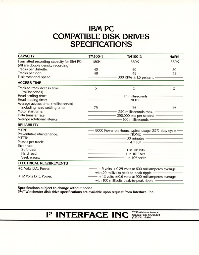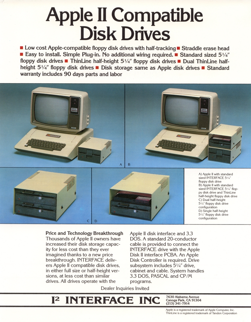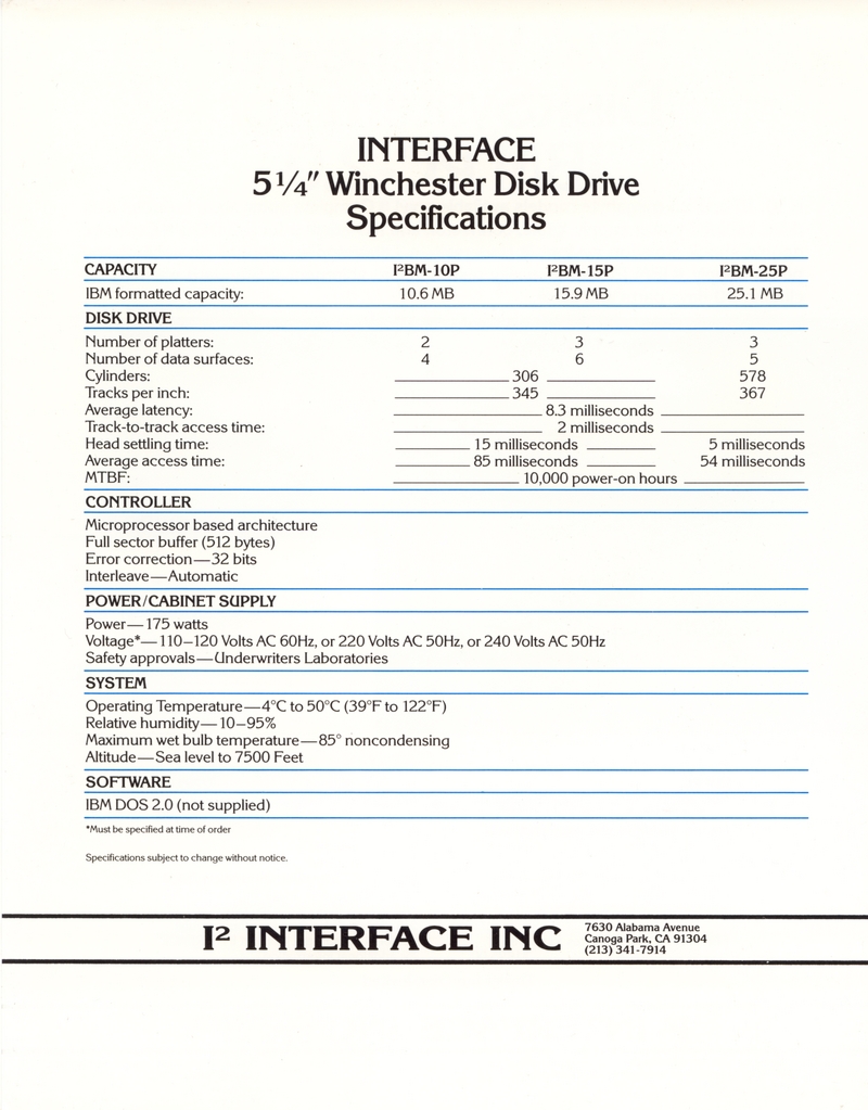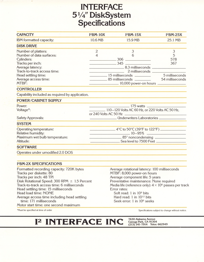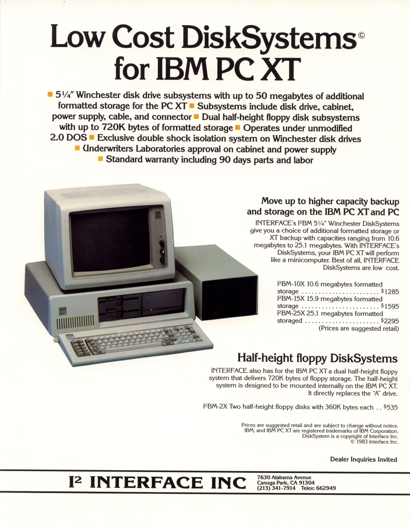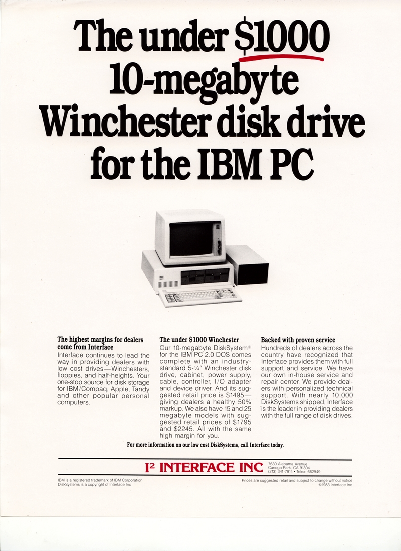 | DESCRIPTION | The 1984 Interface Inc. Catalog, including a number of Winchester and external hard drives for the IBM-PC. Intended for a 5 1/4" form factor and all reasonably priced in the thousands (1984) |
