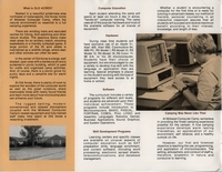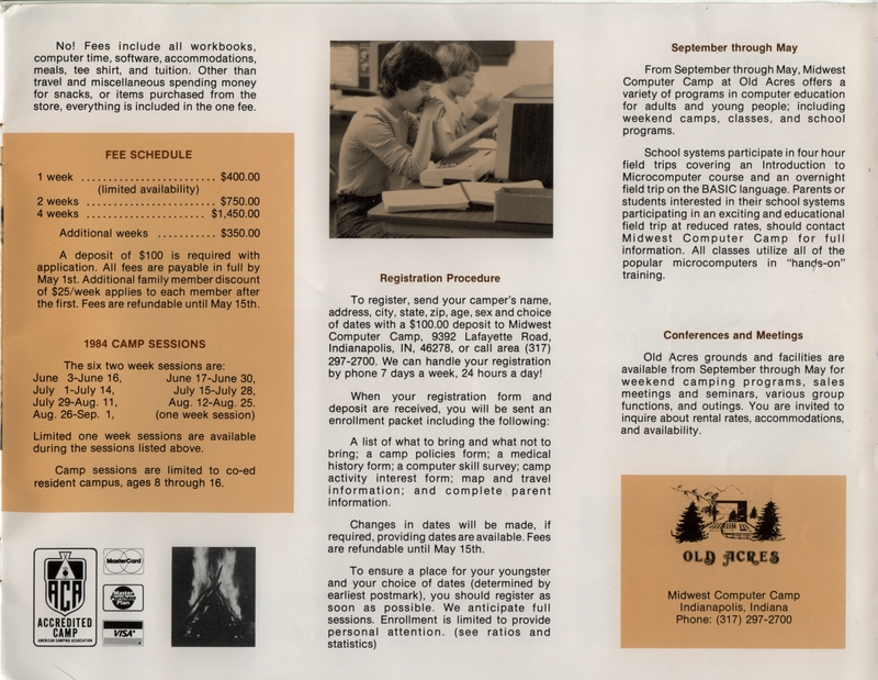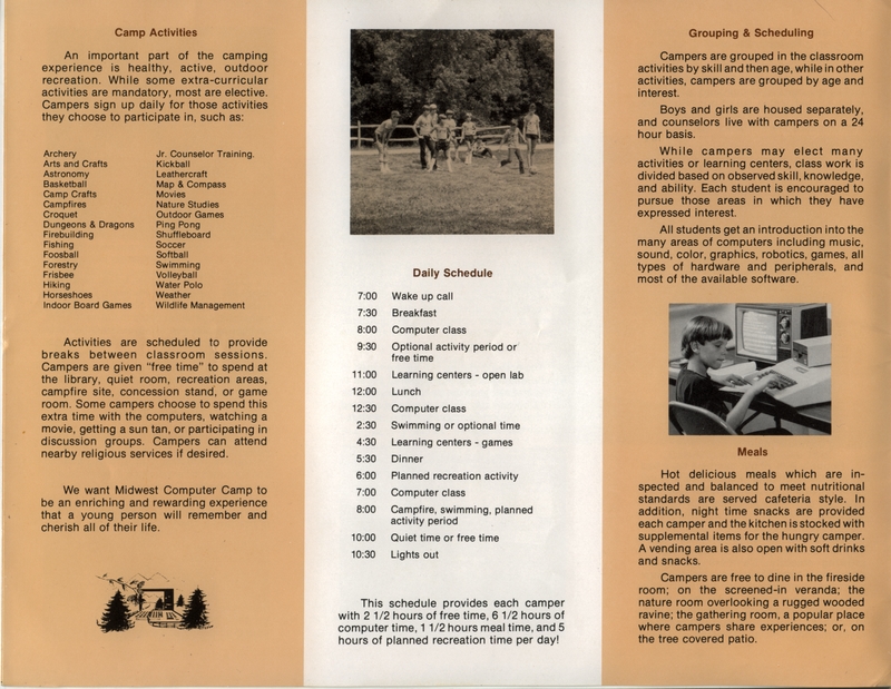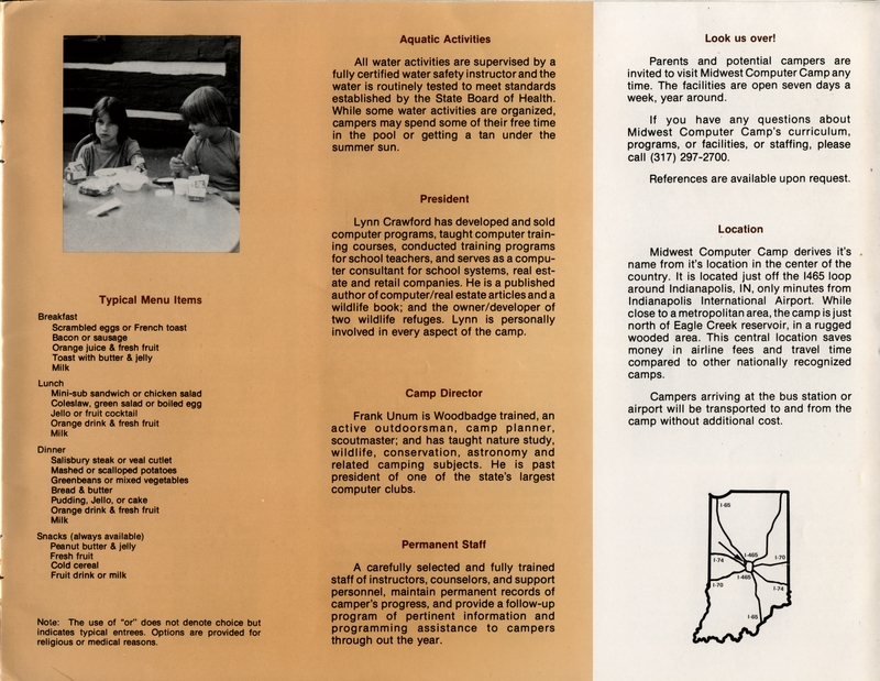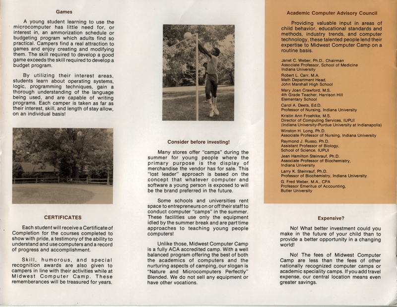 | DESCRIPTION | Brochure with information about a Computer Camp in Indiana, including descriptions, proposed meals and credentials of staff (1984) |