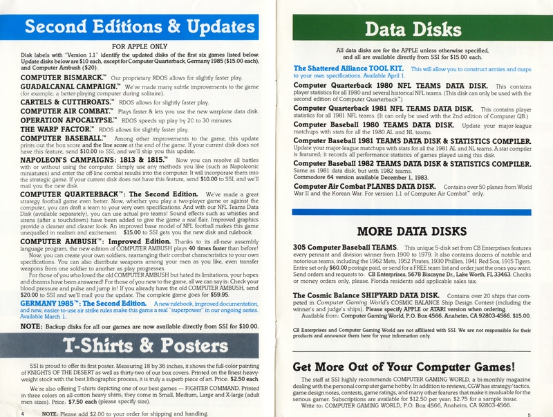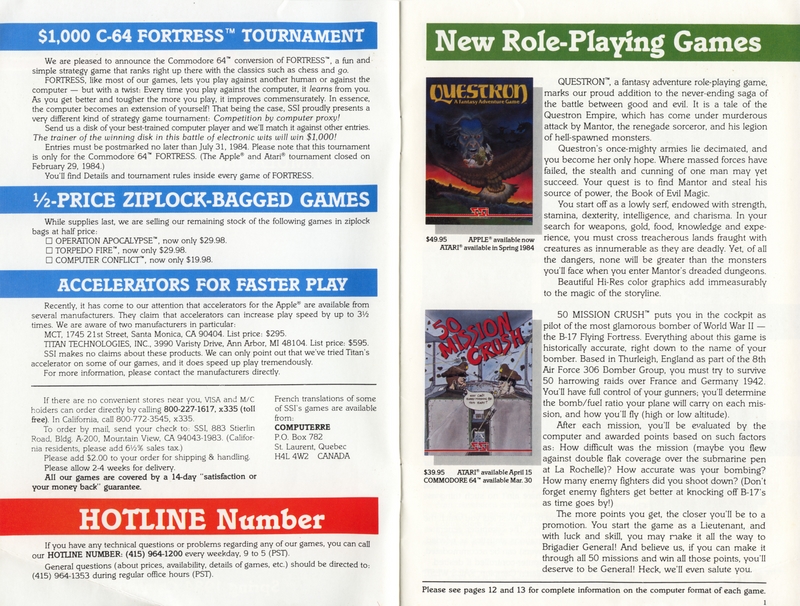 | DESCRIPTION | Spring 1984 Catalog for Strategic Simulations, Inc., a game company focused on turn-based games or simulations (with a branching out into arcade-style games as well) Originally a half-page booklet, scanned across to keep the visual look of the majority of catalog pages. (1984) |