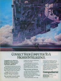 | DESCRIPTION | Ad for Compuserve, featuring beautiful shot of a computer user connecting to a vast floating technoplogical miasma of an entity; a visual simile for Compuserve but even more appropriate for the Internet. From August 1988 issue of OMNI (1988) |