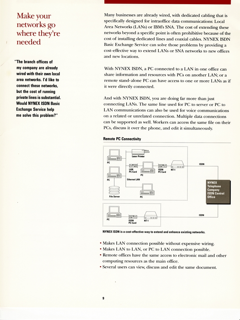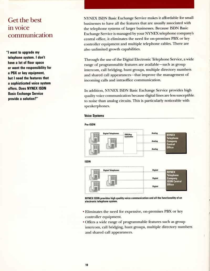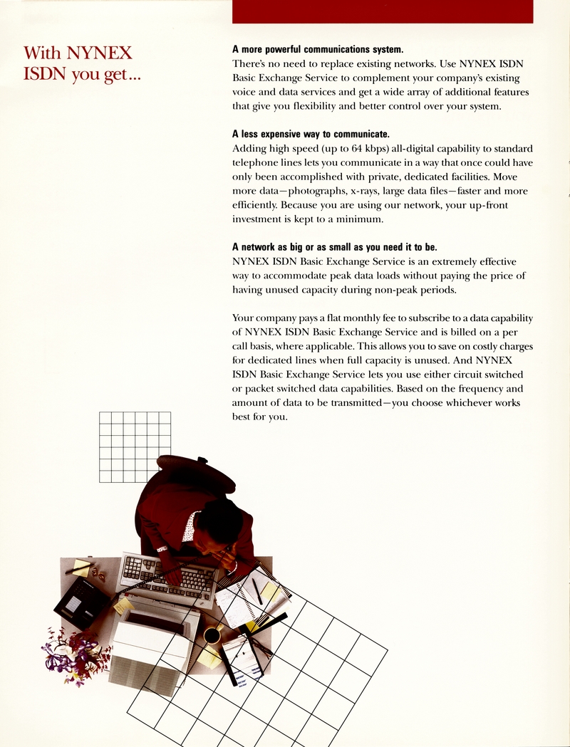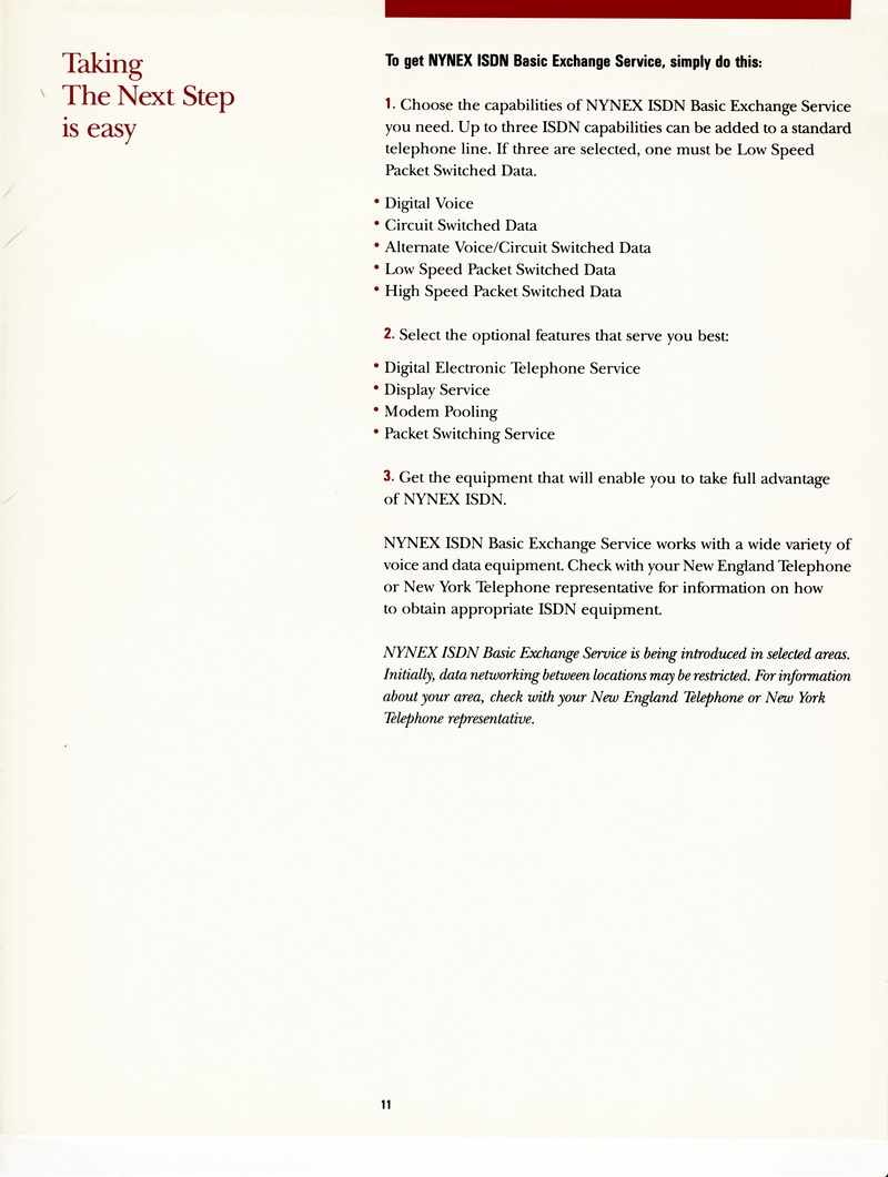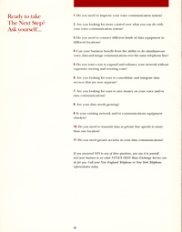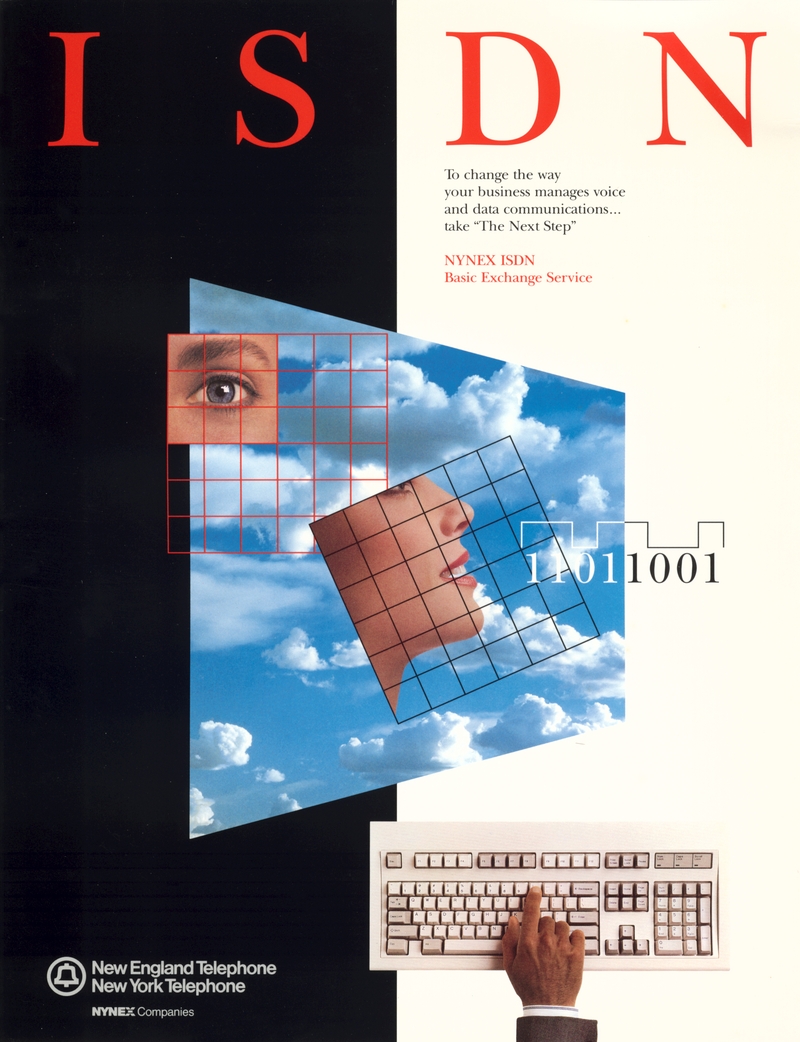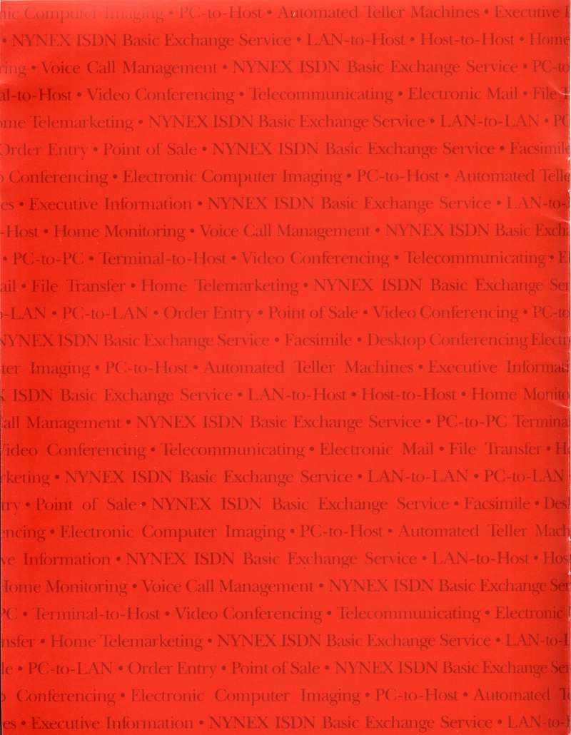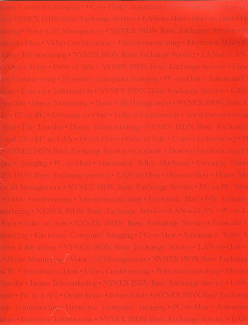 | DESCRIPTION | New England Telephone and New York Telephone, soon to be NYNEX, introduce you to ISDN, to change the way your business manages voice and data communications: NYNEX ISDN Basic Exchange Service. 16-Page pamphlet outlining the magic of ISDN, the way it can join your network, and its advantages. (1990) |