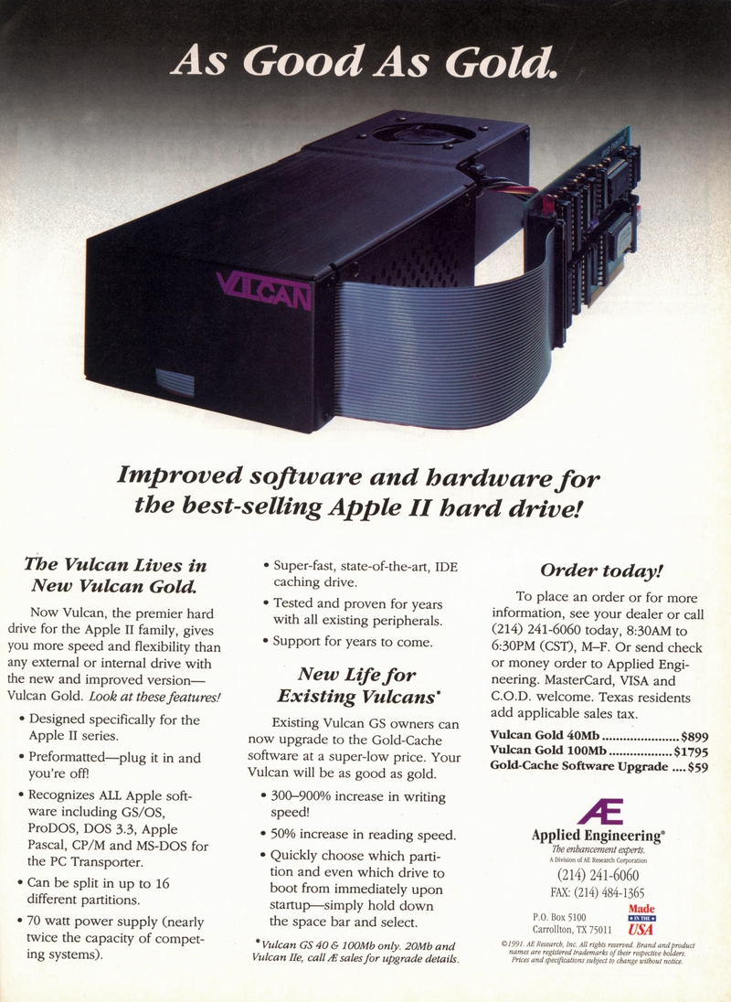 | DESCRIPTION | As Good as Gold: Improved software and hardware for the best-selling Apple II hard drive, the New Vulcan Gold from Applied Engineering. Sizes include 40mb and 100mb ($899 and $1795, respectively). (April, 1992) |
