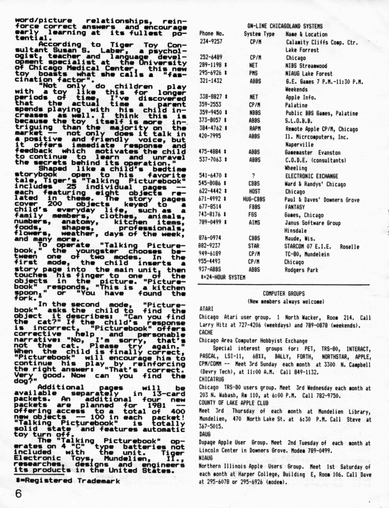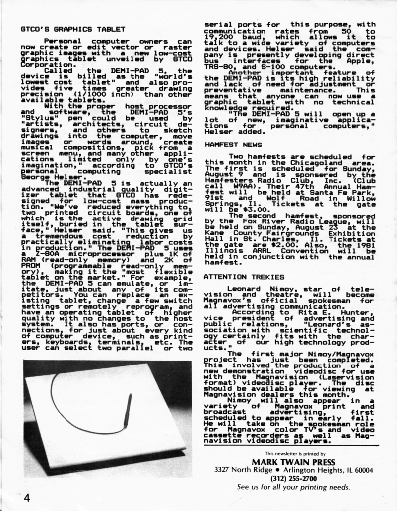 | DESCRIPTION | The August 1981 edition of the Electronic Exchange Newsletter. (Volume 1, Issue 8). Includes description of how the newsletter is made, subscription TV, Hamfest News, Sharp's Pocket Calculator, Tiger's Talking Picturebook, a list of bulletin boards, and a review of the Bearcat 100 (August, 1981) |
