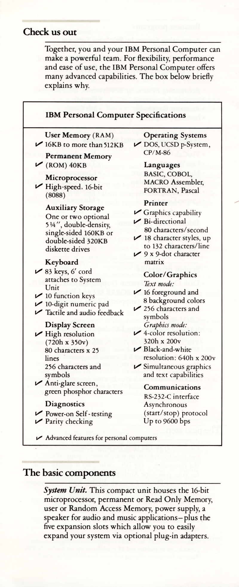 | DESCRIPTION | Brochure for the IBM Personal Computer (PC). Contains information on the system, software available, and types of additional services that could be purchased. This was the November 1982 version of the brochure, meaning it was part of the first wave of IBM PCs, with the full weight of the IBM Marketing Machine behind it (1982) |