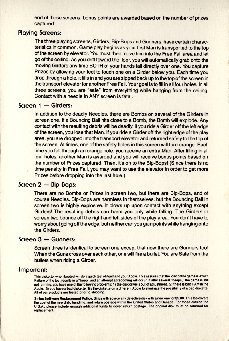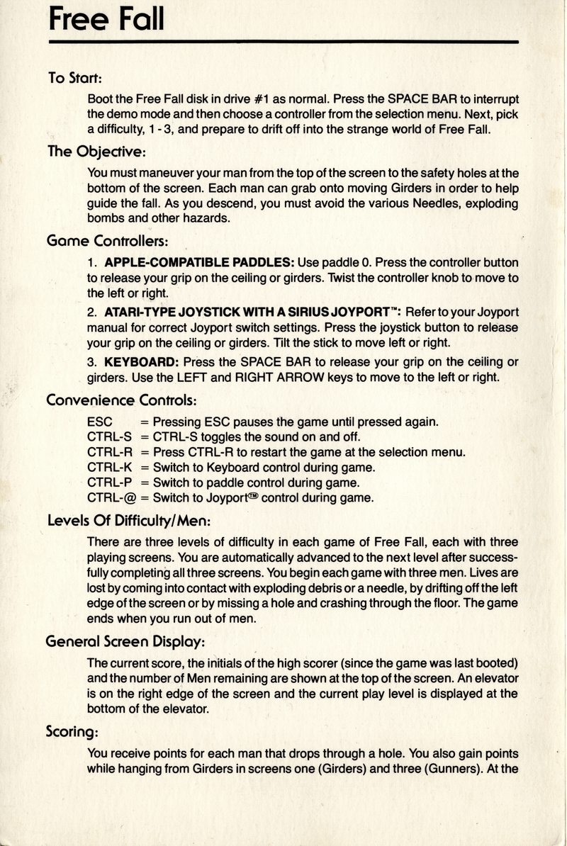 | DESCRIPTION | Documentation for the game "Free Fall", a fast action game from Sirius for the Apple II or II+ Computer with 48k and One Apple Disk Drive (1982) |