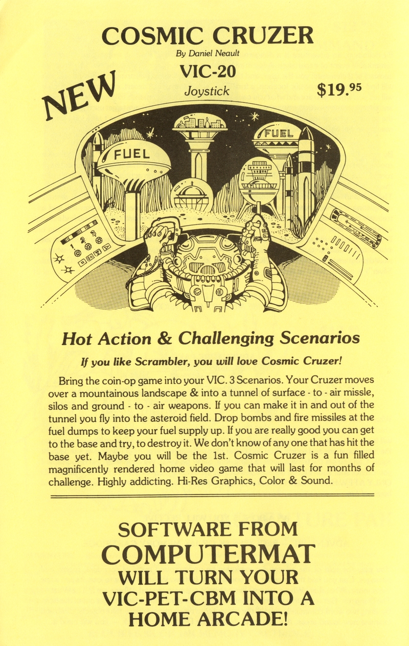 | DESCRIPTION | 20-page catalog (two pages are combined as a spread) of a Commodore VIC and C-64 catalog for Computermat Systems, a publisher of games and adventures. Includes call for authors, lists of games, and offers of packs and specials (1983) |