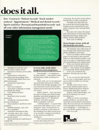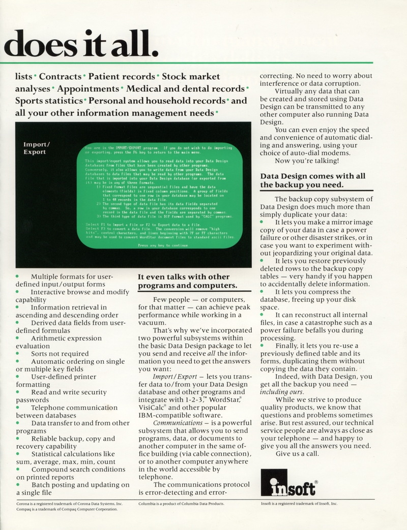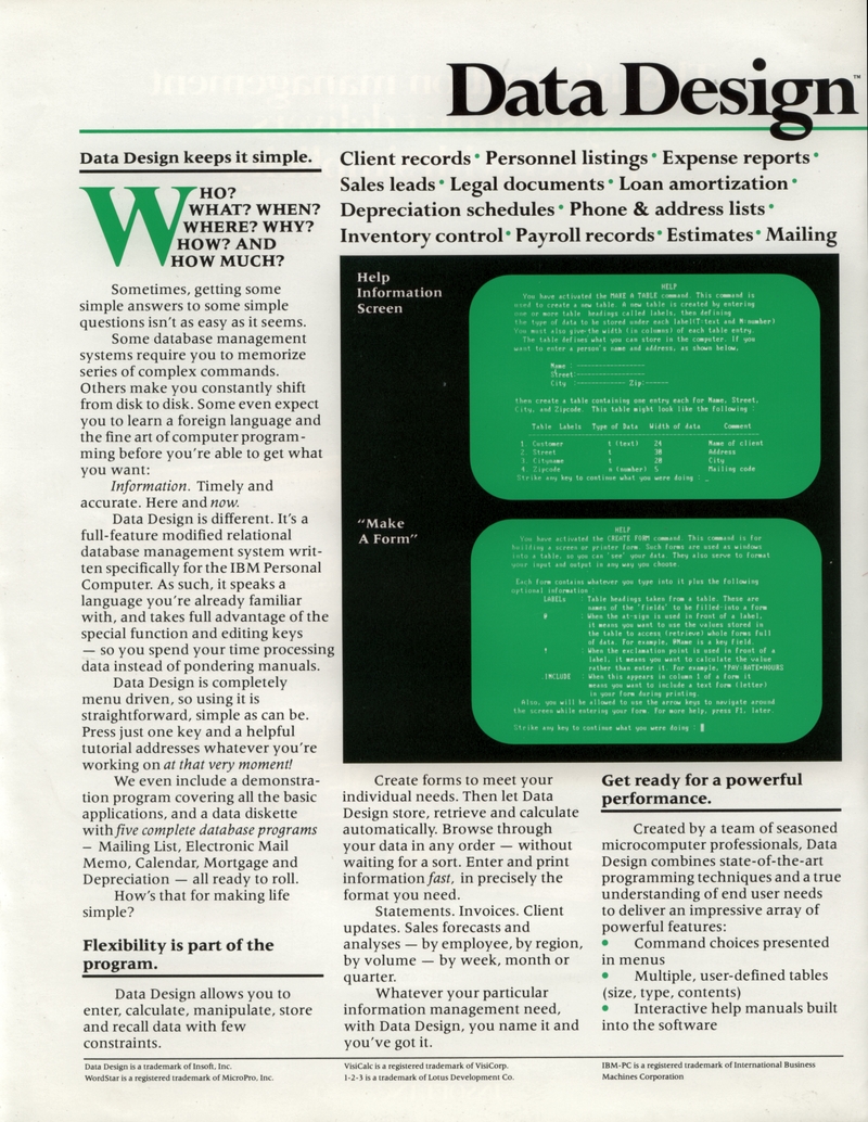 | DESCRIPTION | Brochure for Data Design by InSoft, "The Information Management System that Delivers Power with Simplicity." Cover indicates it as a companion to Lotus 1-2-3 and Micropro Wordstar (1983) |