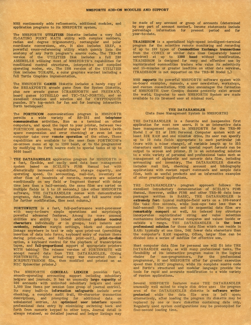 | DESCRIPTION | Brochure of MMS (Miller Microconputer Systems) Forth and Forth Software (1983) |