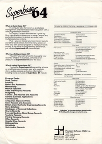 | DESCRIPTION | Cover letter and flyer for the Superbase 64 by Precision Software of Surrey and New York, the "new concept in database management / complete information system for the Commodore 64" (1983) |