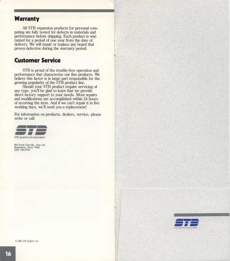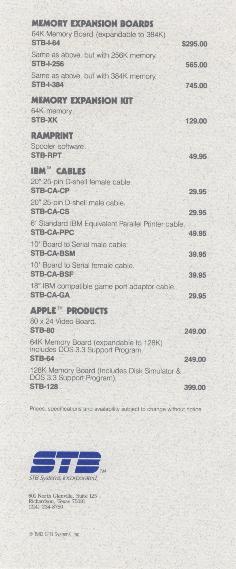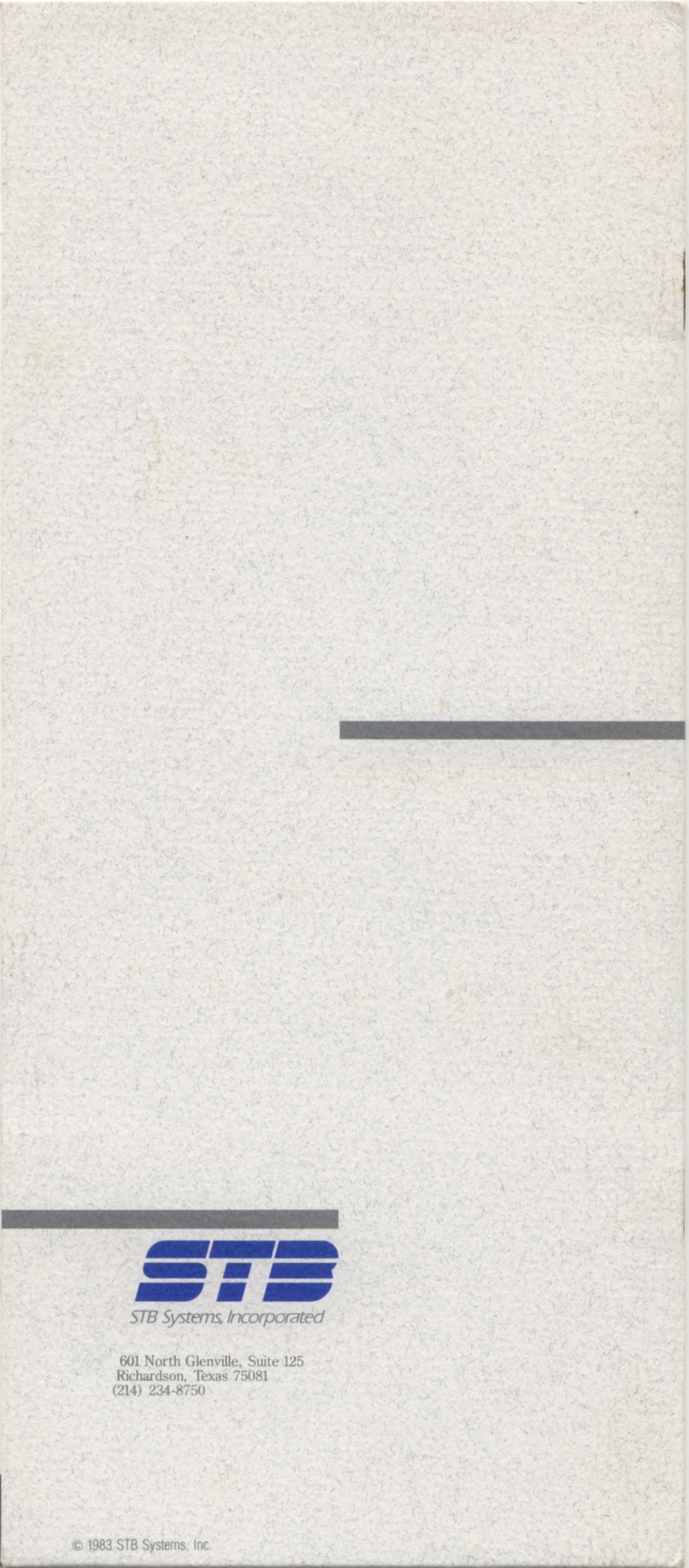 | DESCRIPTION | "STB Systems Incorporated: Expansion Products for Personal Computing" - Small brochure catalog for a range of expansion cards for Apple IIs and IBM PCs, including video, RAM, and input/output. Includes separate price list on accompanying card. STB Systems apparently lived up into the 1990s until getting bought out (1983) |