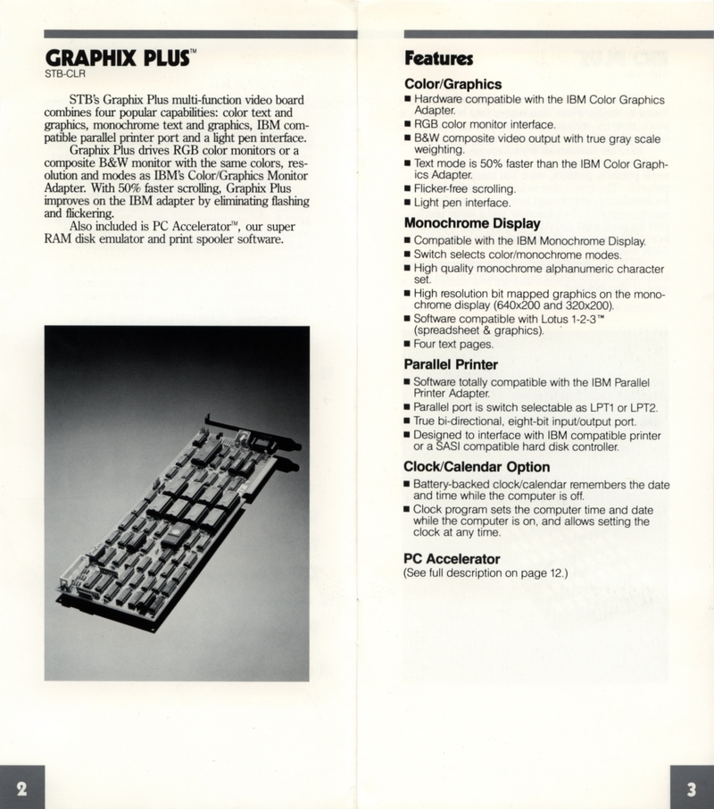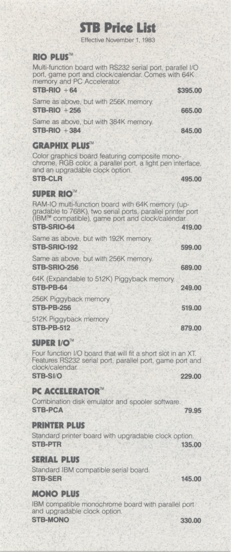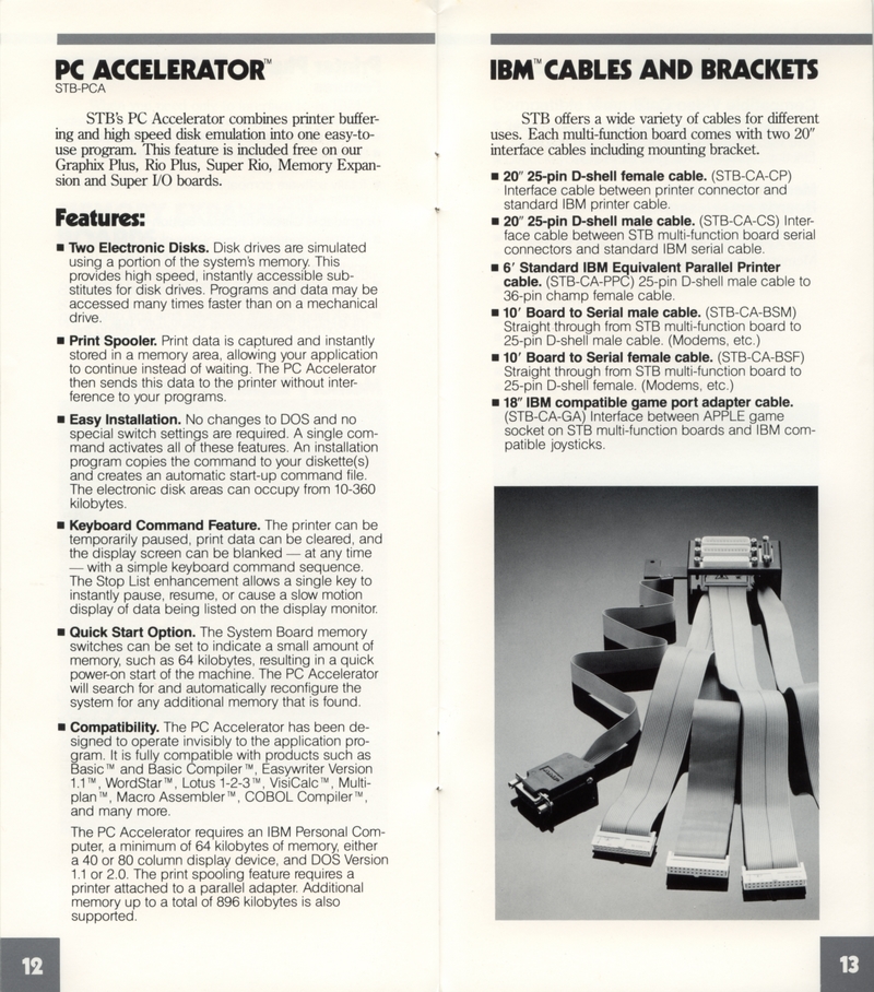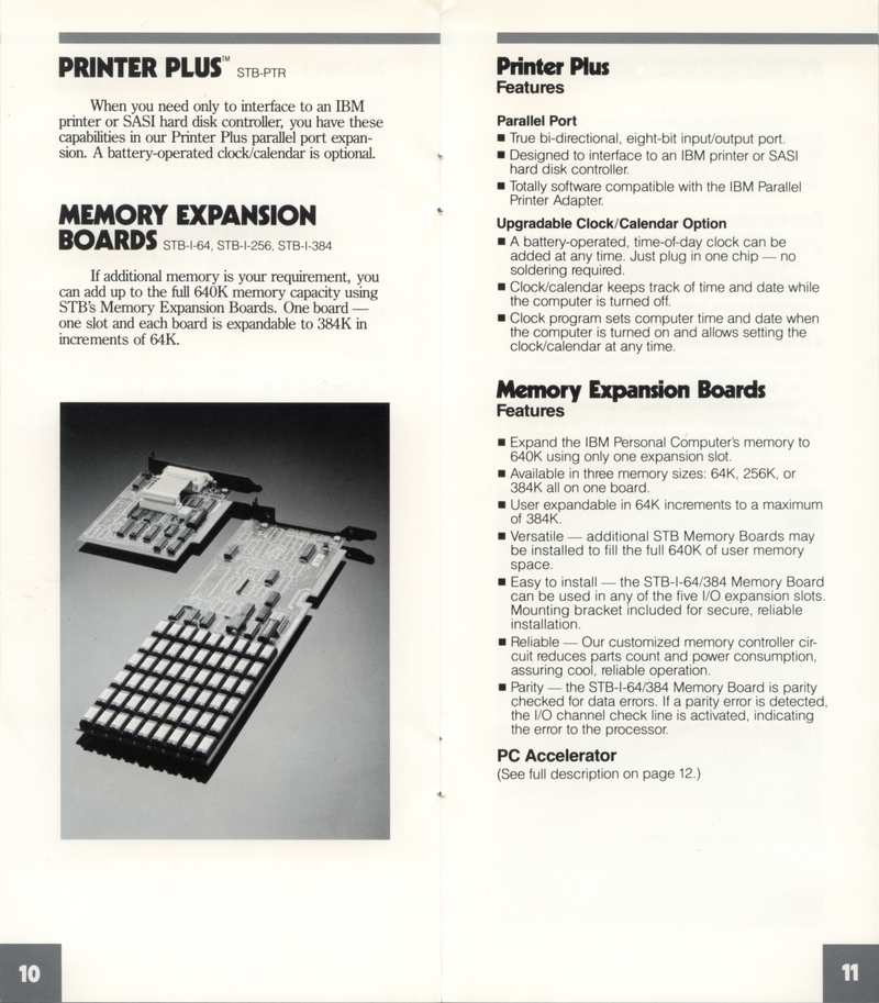 | DESCRIPTION | "STB Systems Incorporated: Expansion Products for Personal Computing" - Small brochure catalog for a range of expansion cards for Apple IIs and IBM PCs, including video, RAM, and input/output. Includes separate price list on accompanying card. STB Systems apparently lived up into the 1990s until getting bought out (1983) |