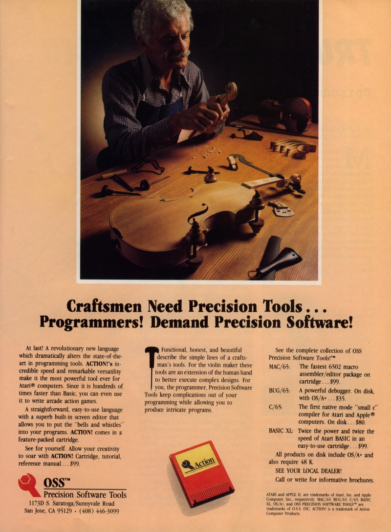 | DESCRIPTION | Demand the best tools for programming; advertisement for utlity cartridge for Atari computers with well-done evocative "craftsman" photo, from Hi-Res Magazine March 1984 Issue (1984) |