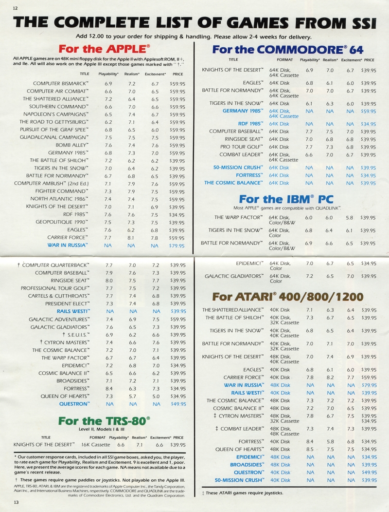 | DESCRIPTION | Spring 1984 Catalog for Strategic Simulations, Inc., a game company focused on turn-based games or simulations (with a branching out into arcade-style games as well) Originally a half-page booklet, scanned across to keep the visual look of the majority of catalog pages. (1984) |