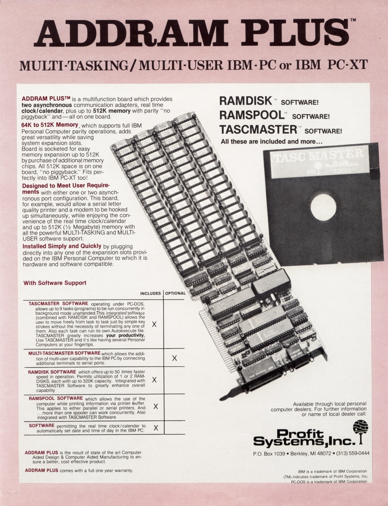 | DESCRIPTION | The ADDRAM PLUS, a Multi-Tasking/Multi-User IBM-PC or IBM-PC-XT Card. Provides Ramdisk, Ramspool and Tascmaster software. From Profit Systems, Inc. |
